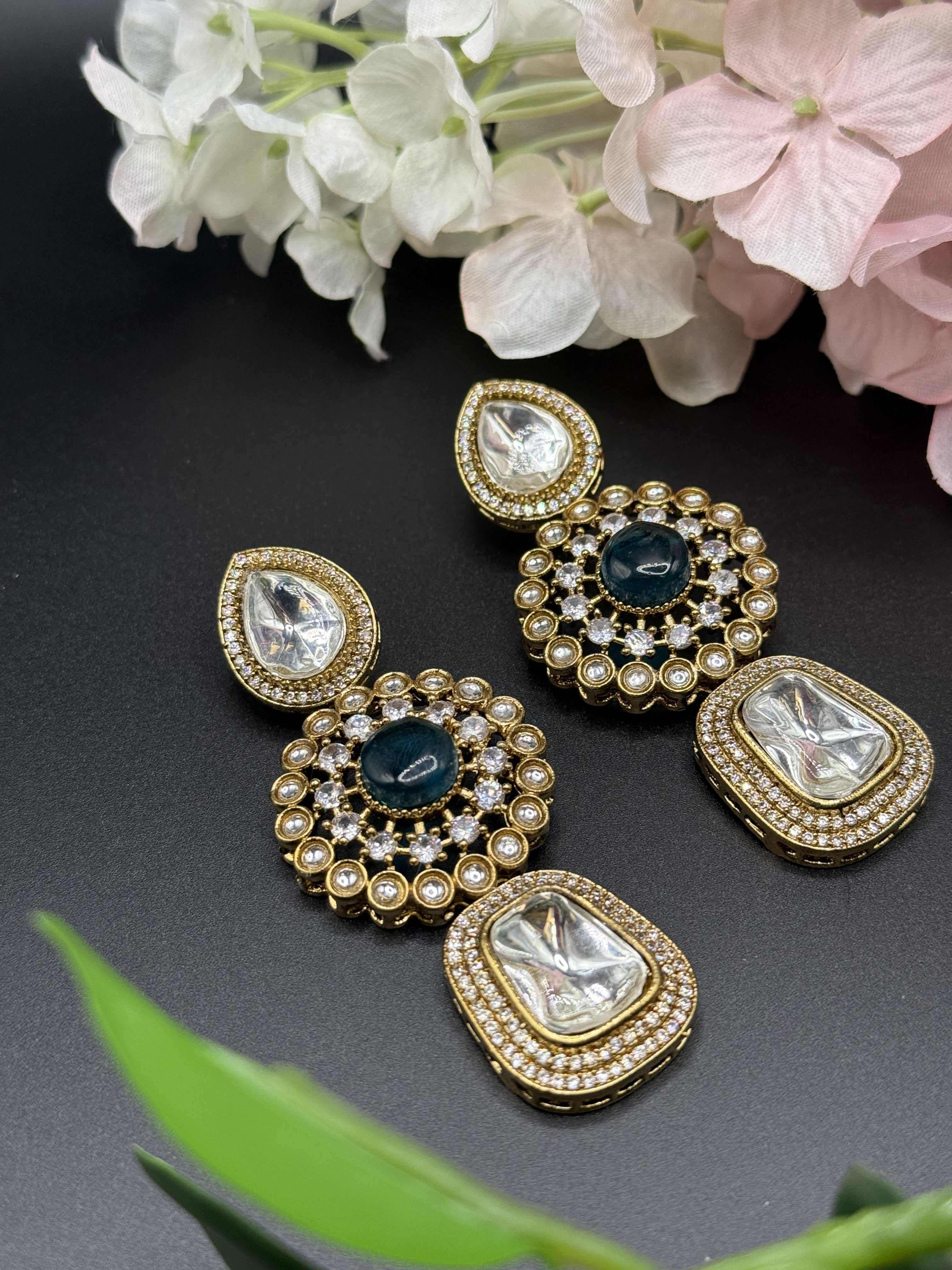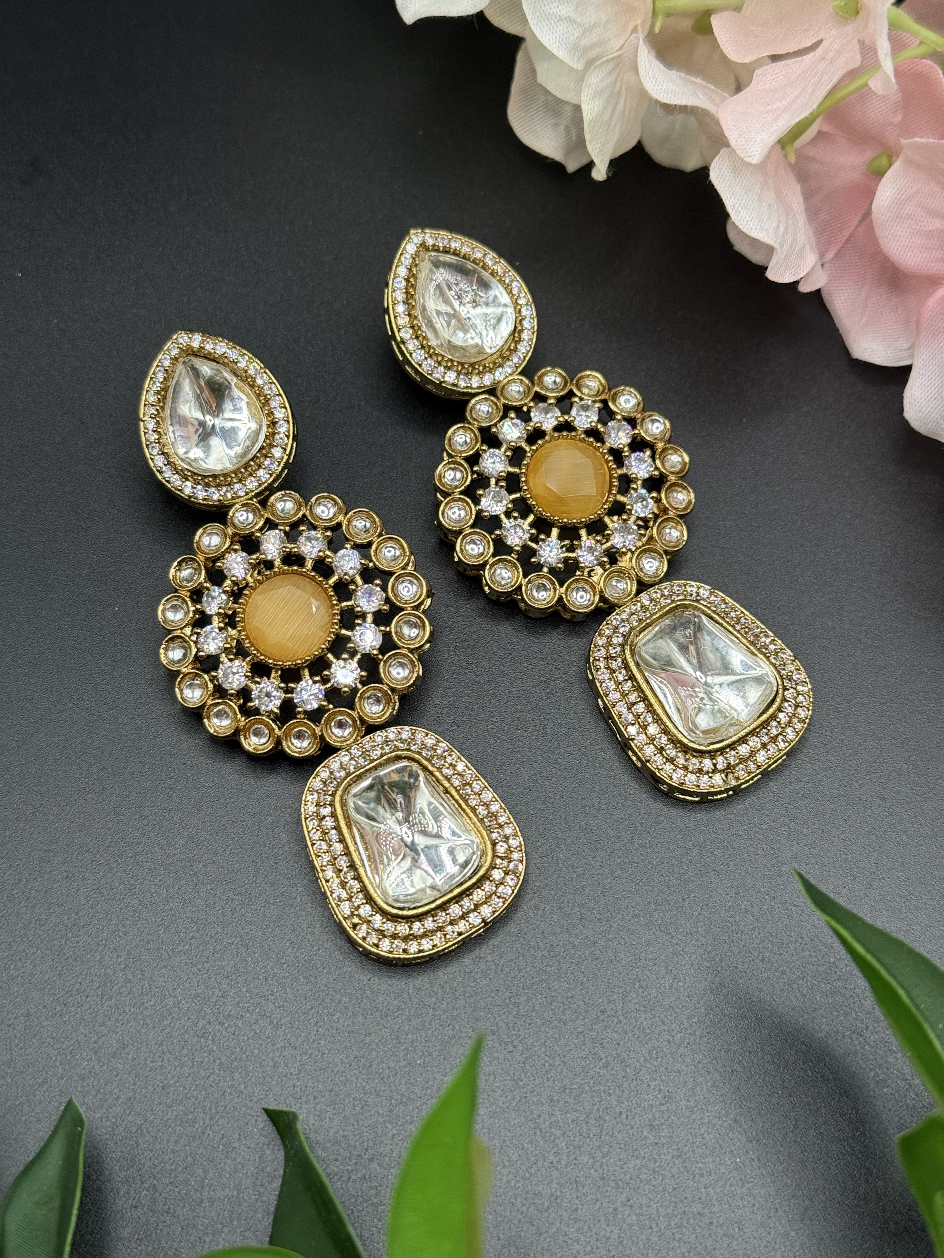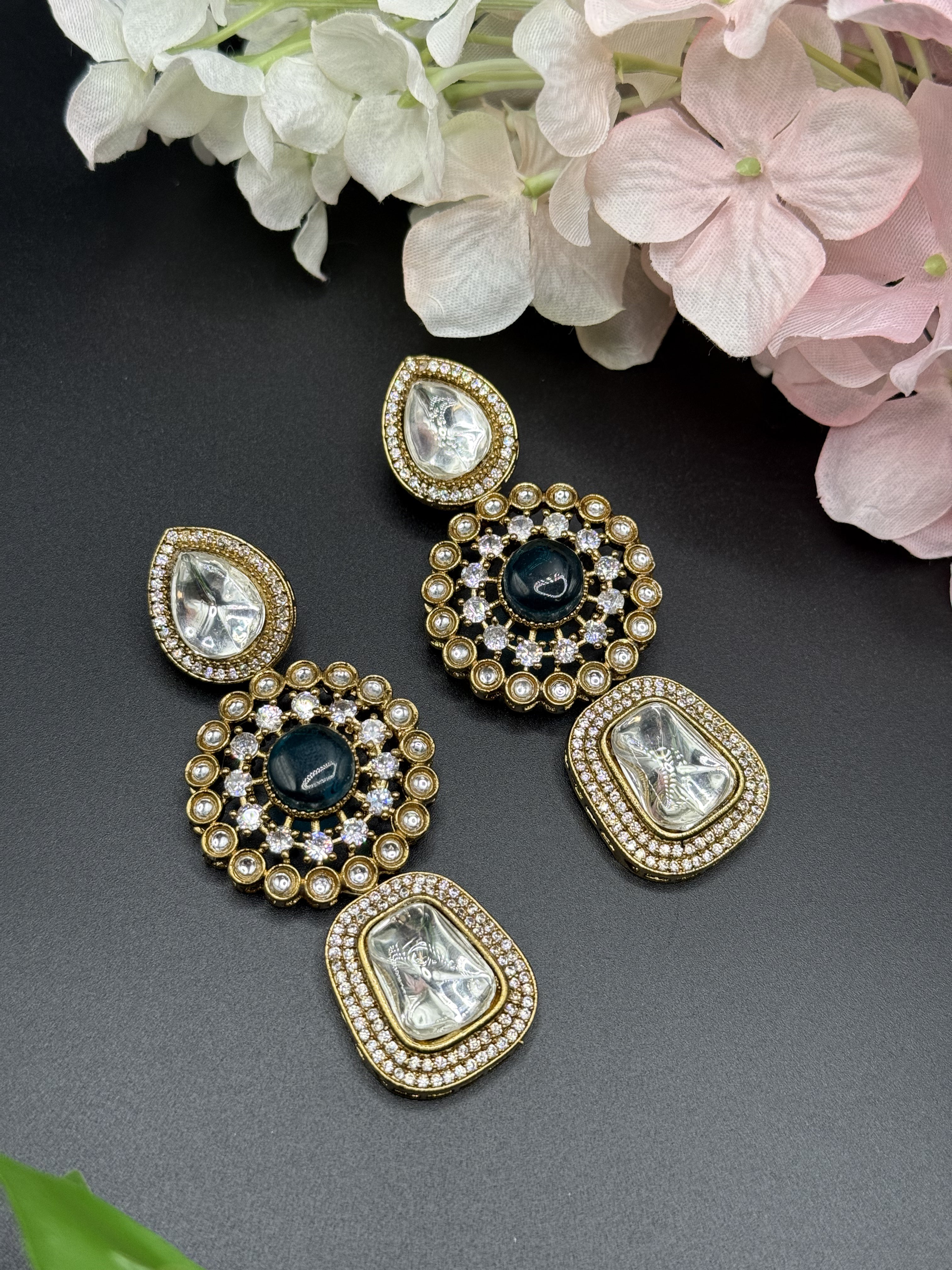 Crafted with care, these stunning earrings feature a brass base adorned with shimmering moissanite kundan and Monalisa stones. Enhanced with an elegant Apala polish, they exude a timeless charm, perfect for elevating any outfit – from traditional attire to modern ensembles.