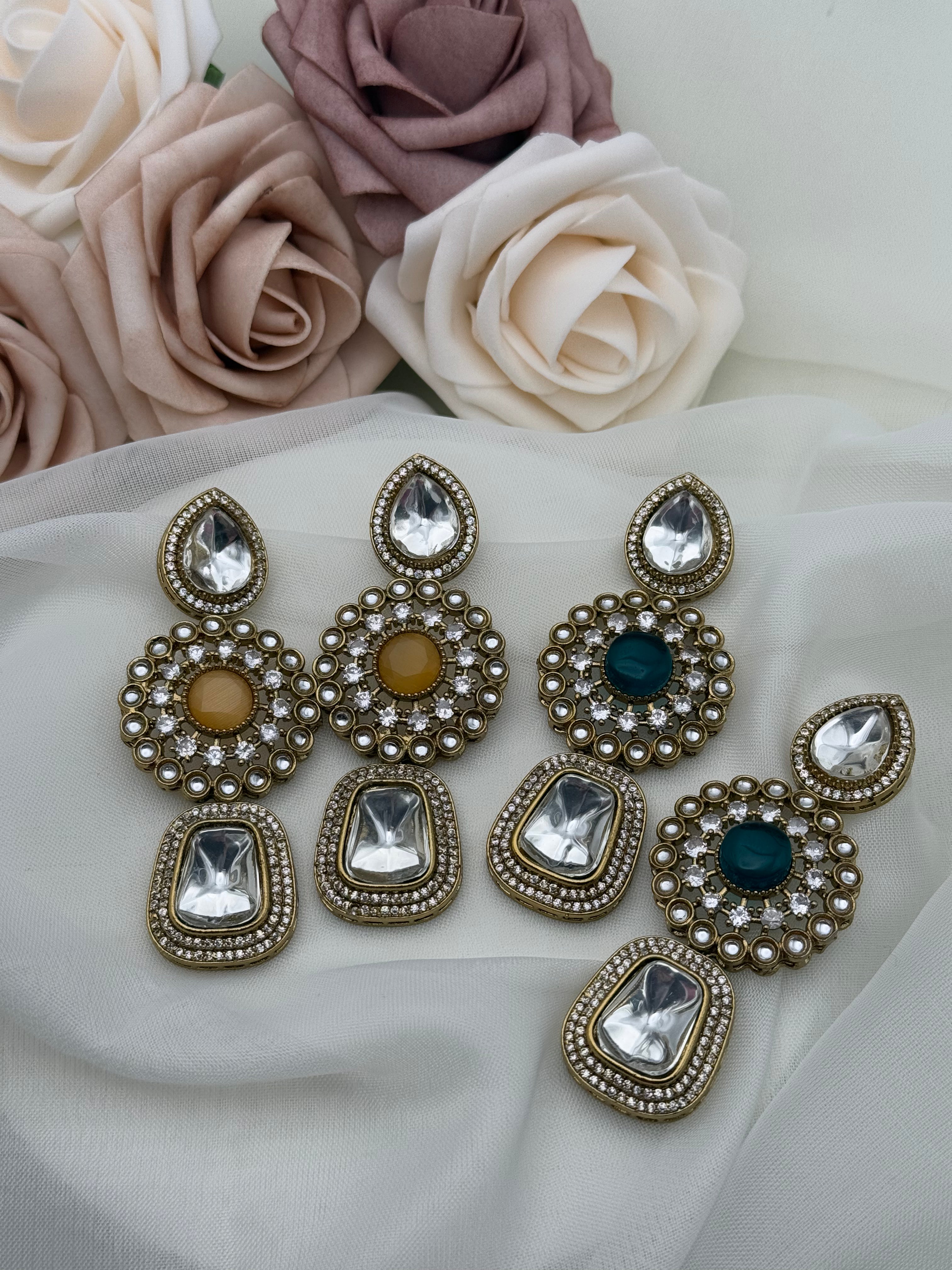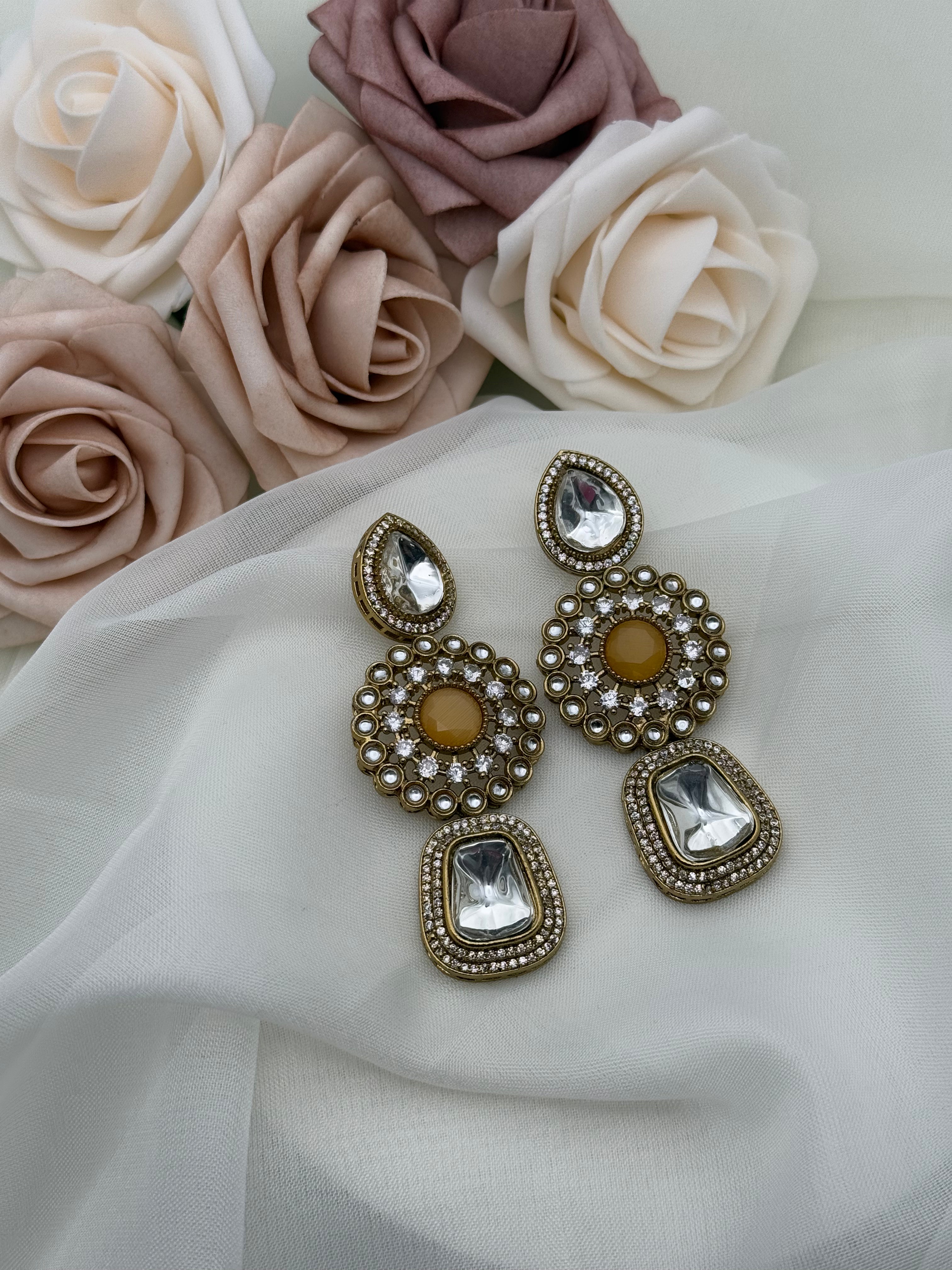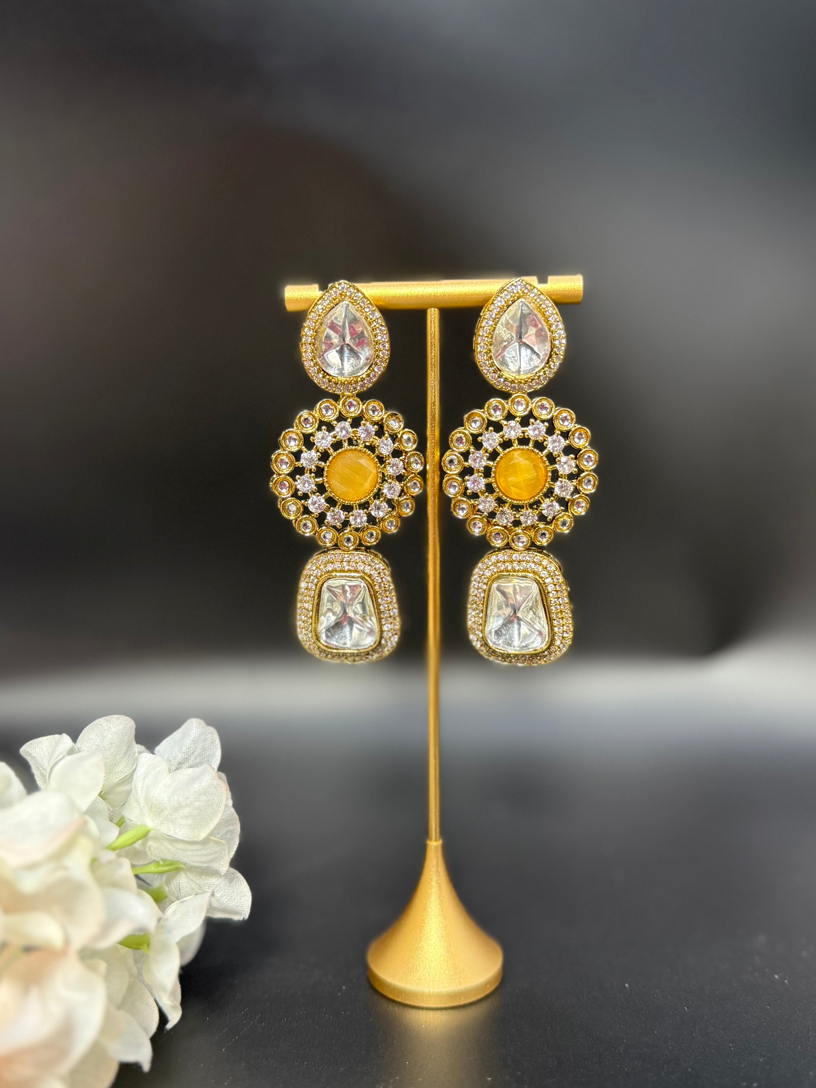 Crafted with care, these stunning earrings feature a brass base adorned with shimmering moissanite kundan and Monalisa stones. Enhanced with an elegant Apala polish, they exude a timeless charm, perfect for elevating any outfit – from traditional attire to modern ensembles.