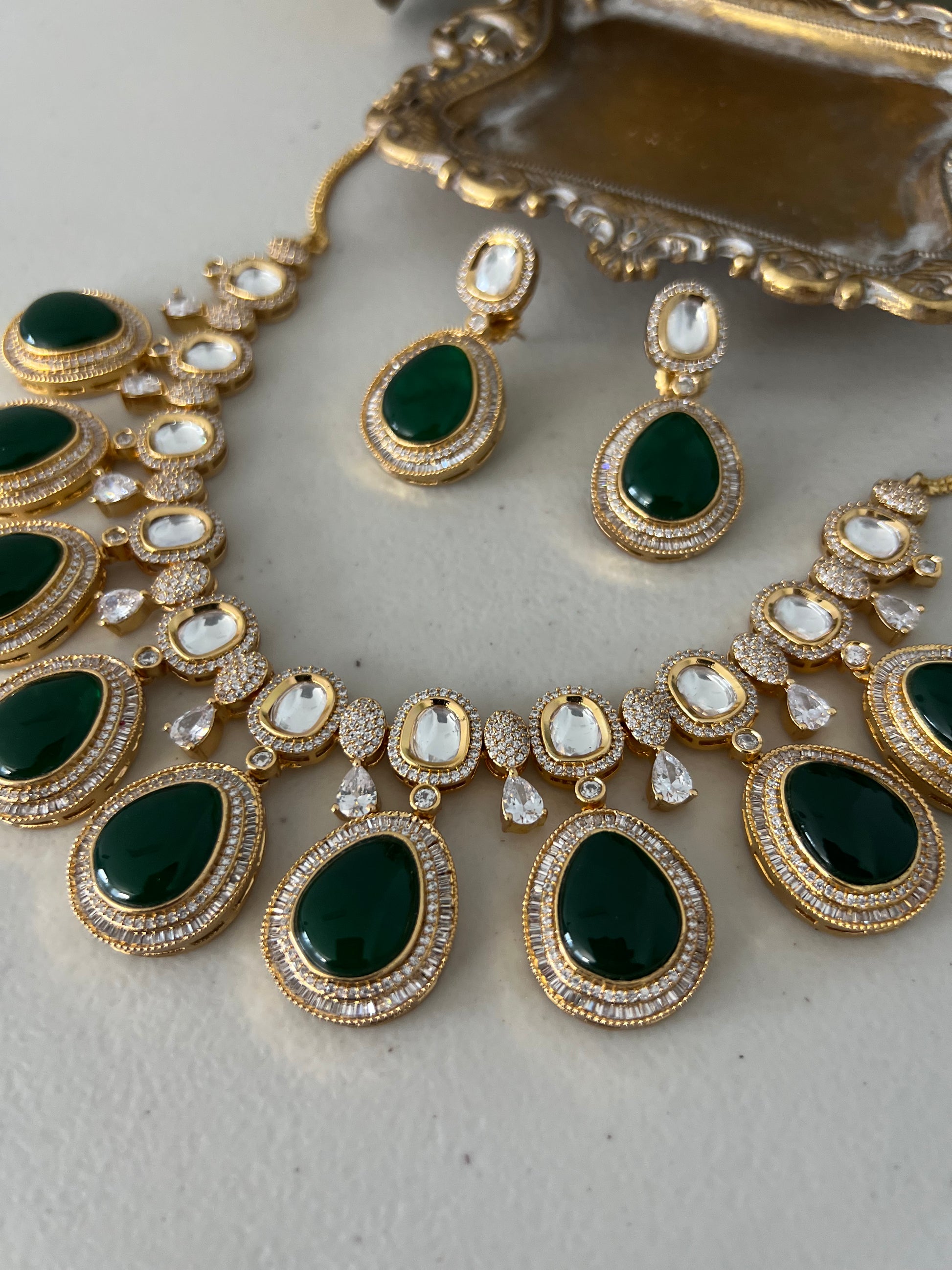 Uncut kundan and american diamond with monalisa stone necklace set in emerald green color