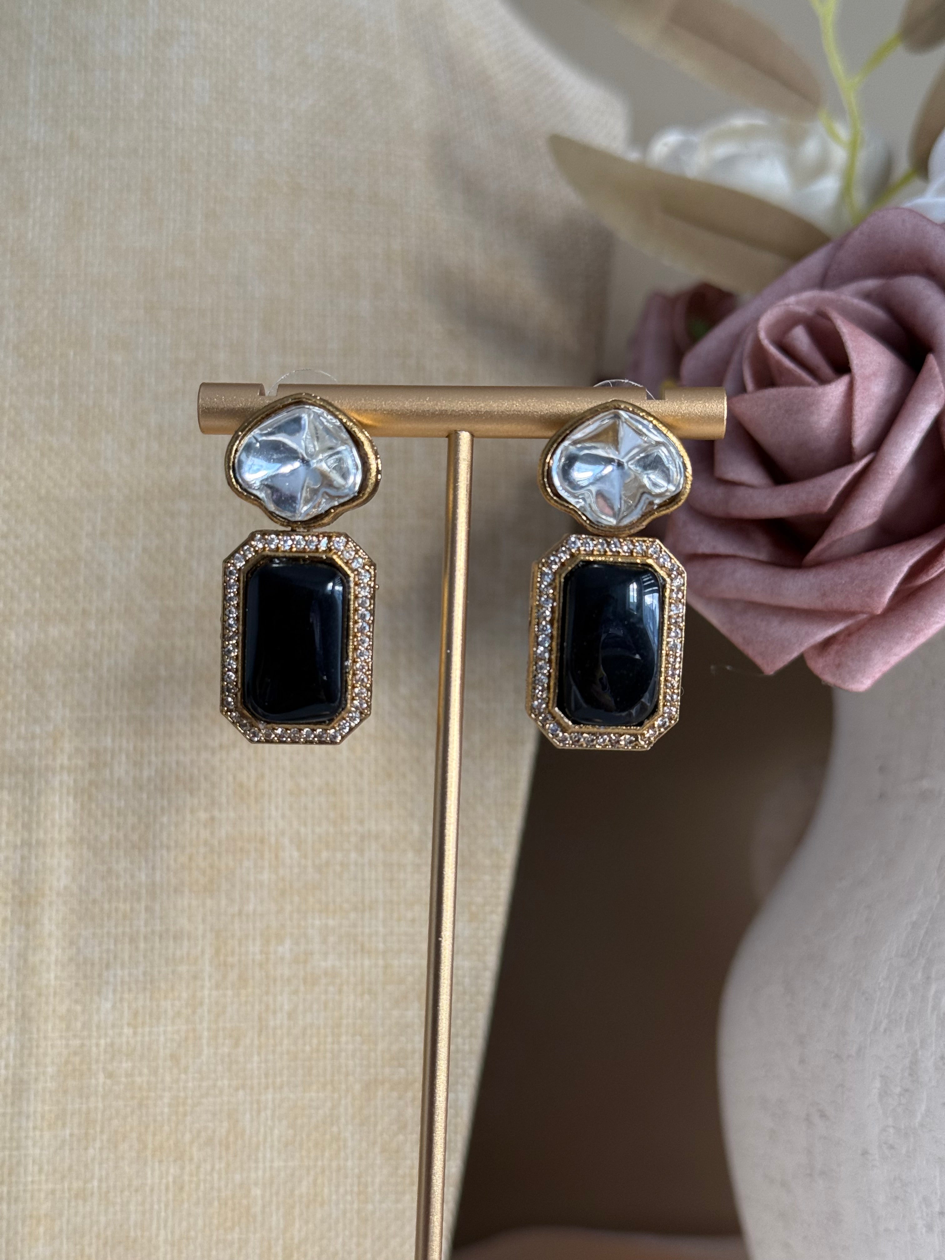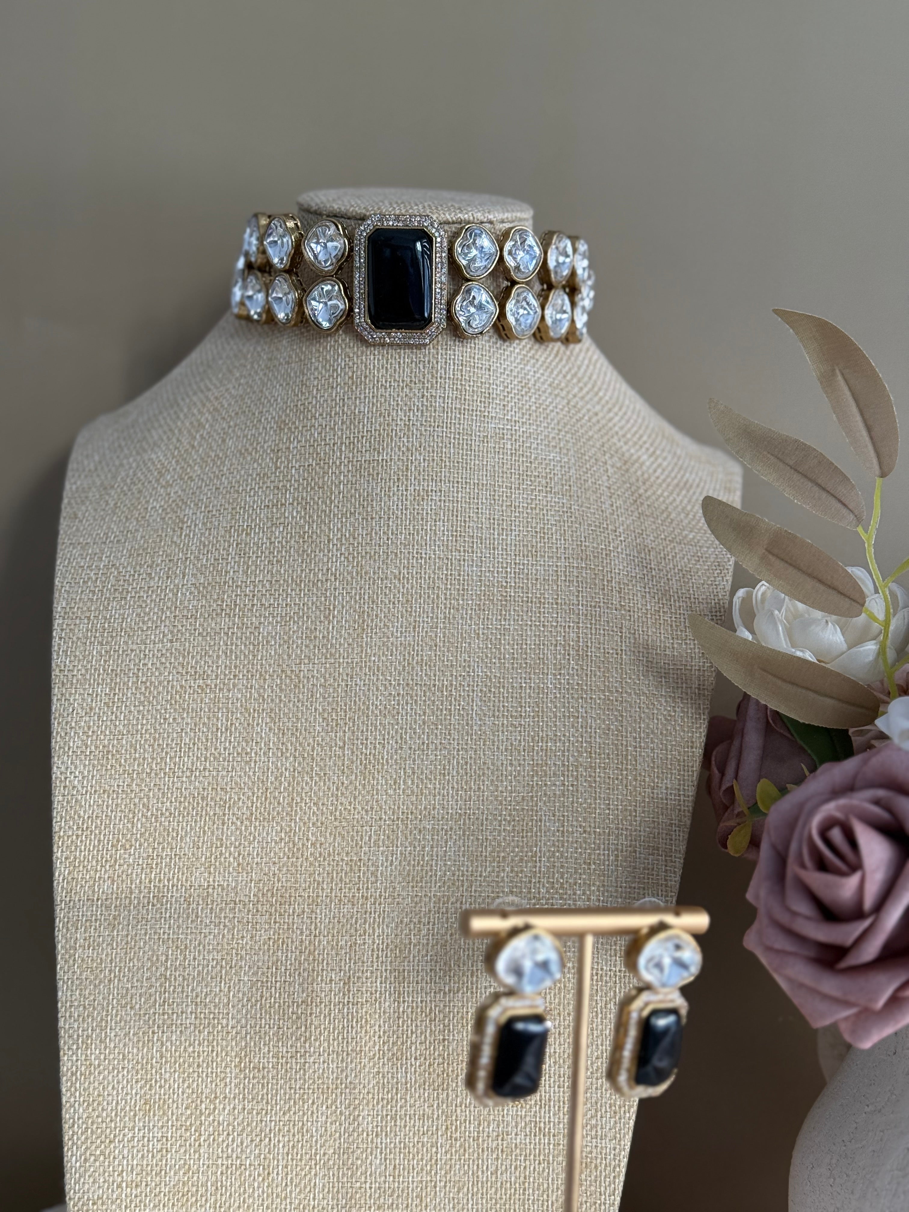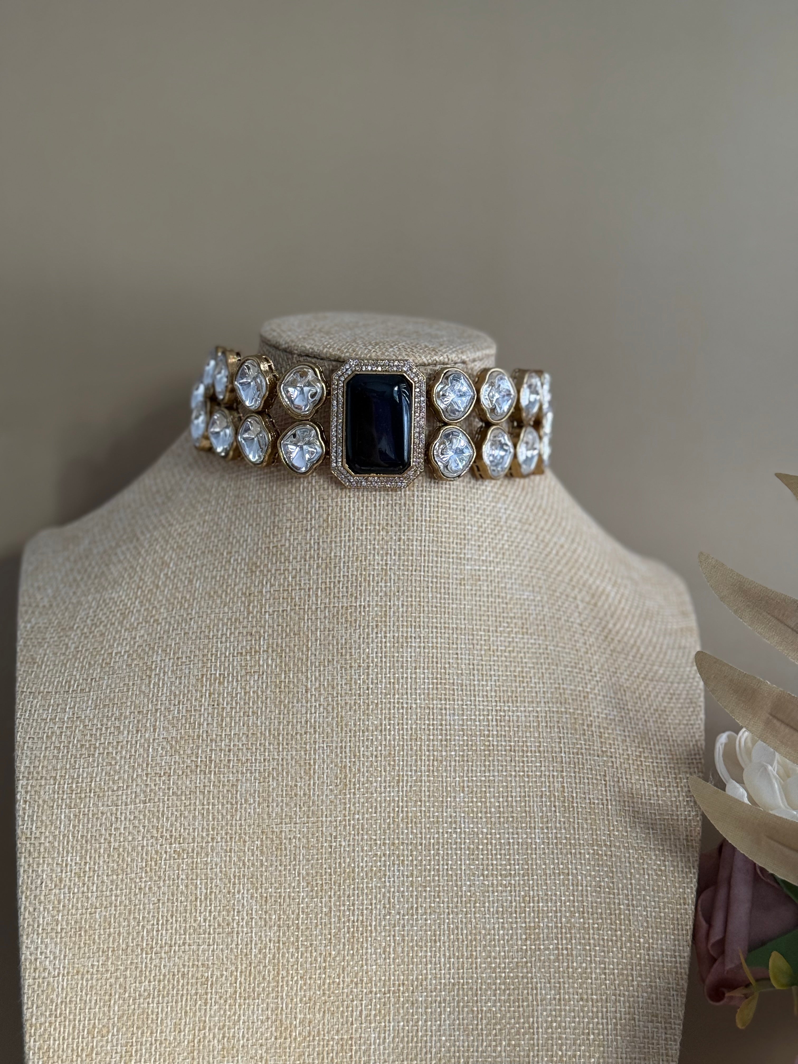 The Jinta Necklace Set features a stunning combination of Moissanite and Monalisa stones, accented by American Diamond choker set and dangle earrings. Elevate your style with this luxurious and elegant set, perfect for any occasion. Expertly crafted for a sophisticated and timeless look.