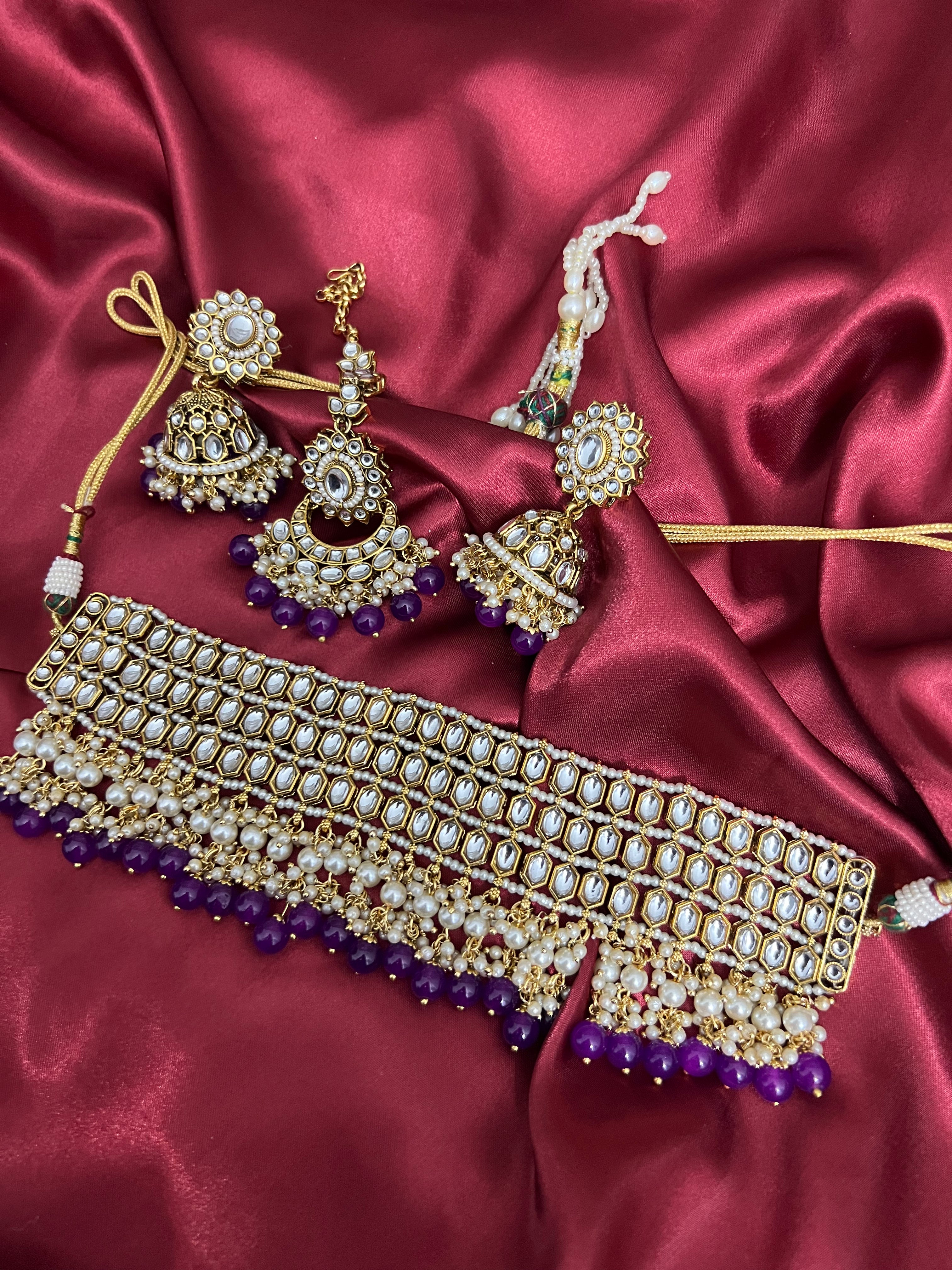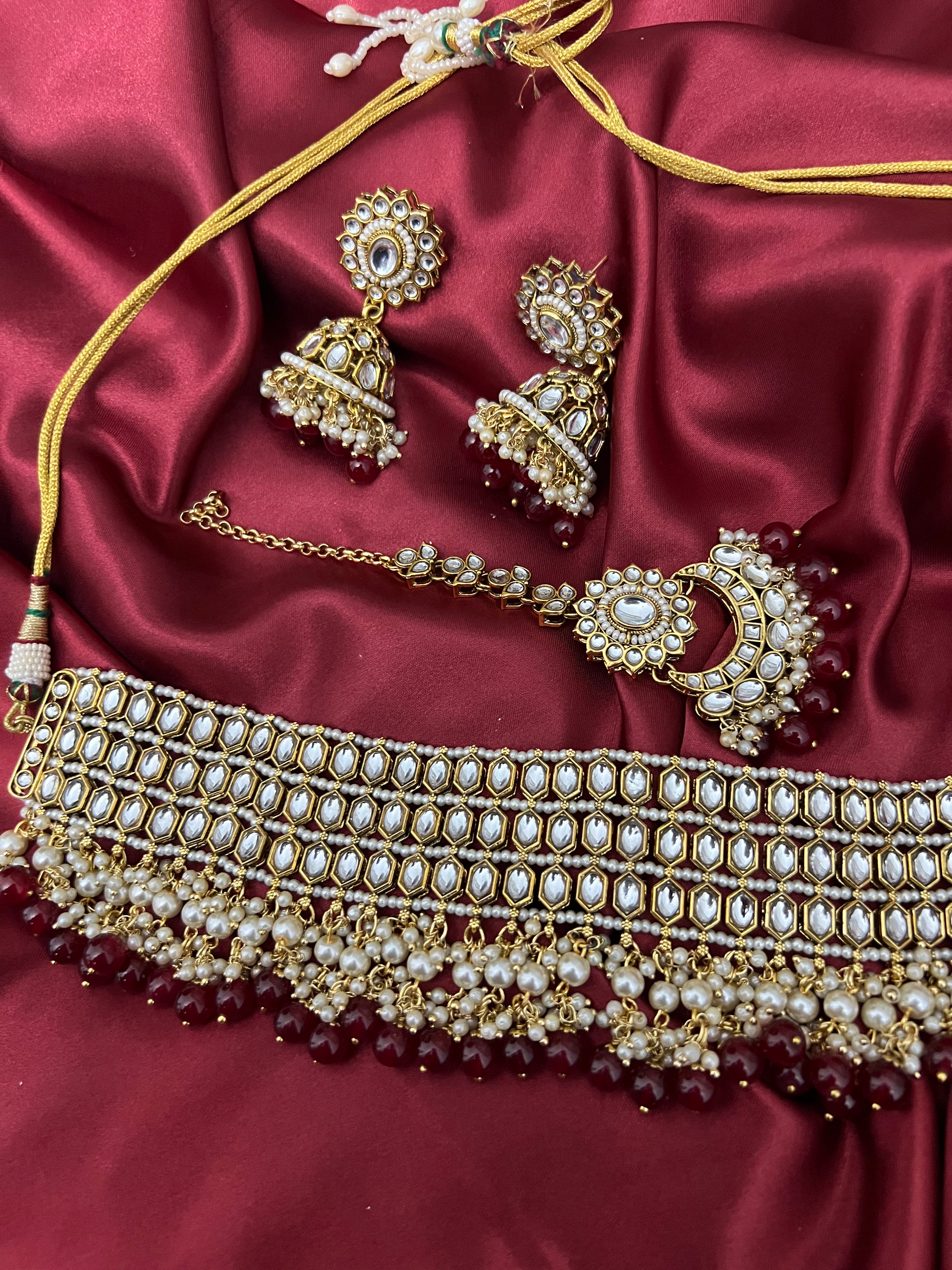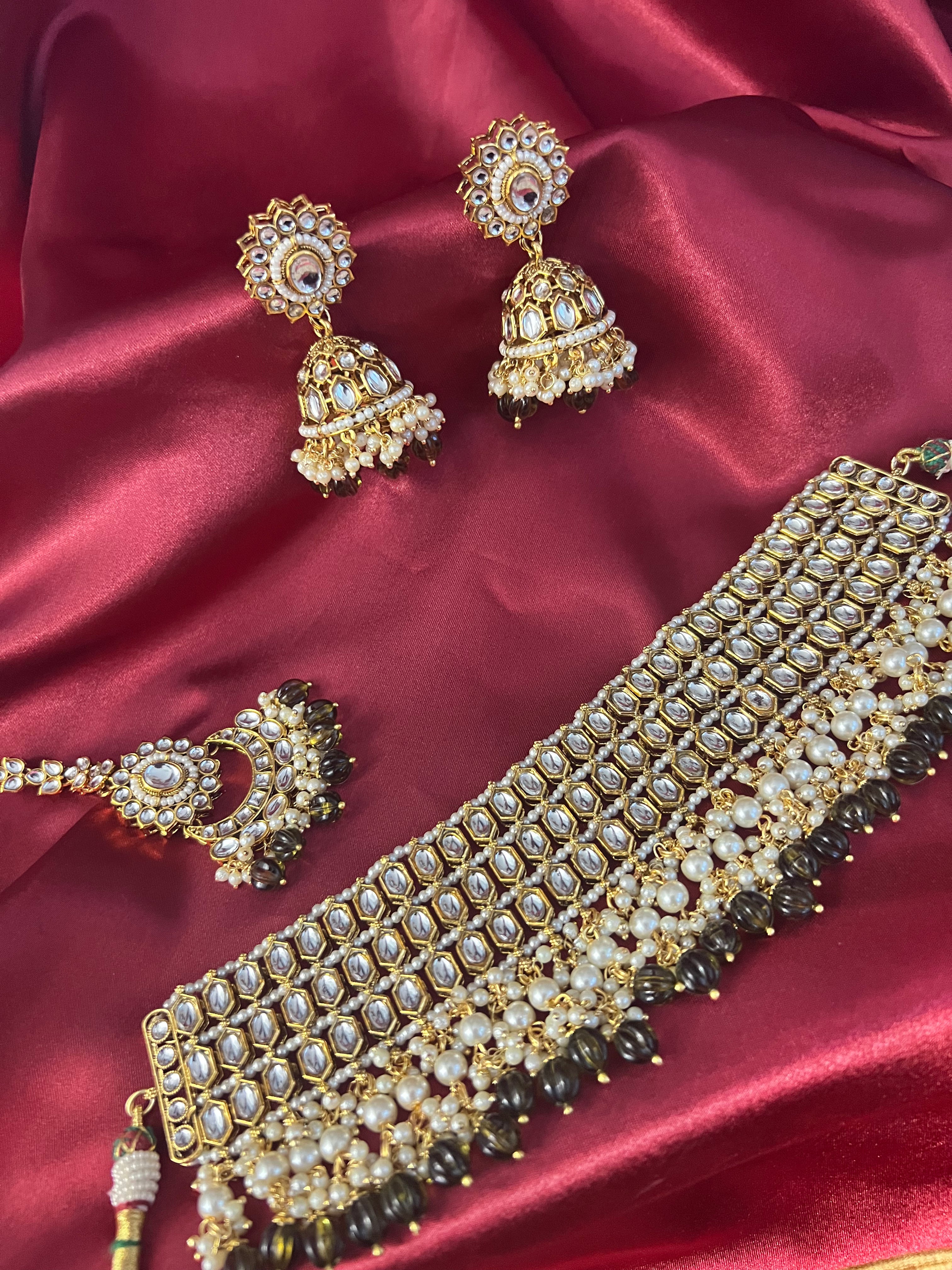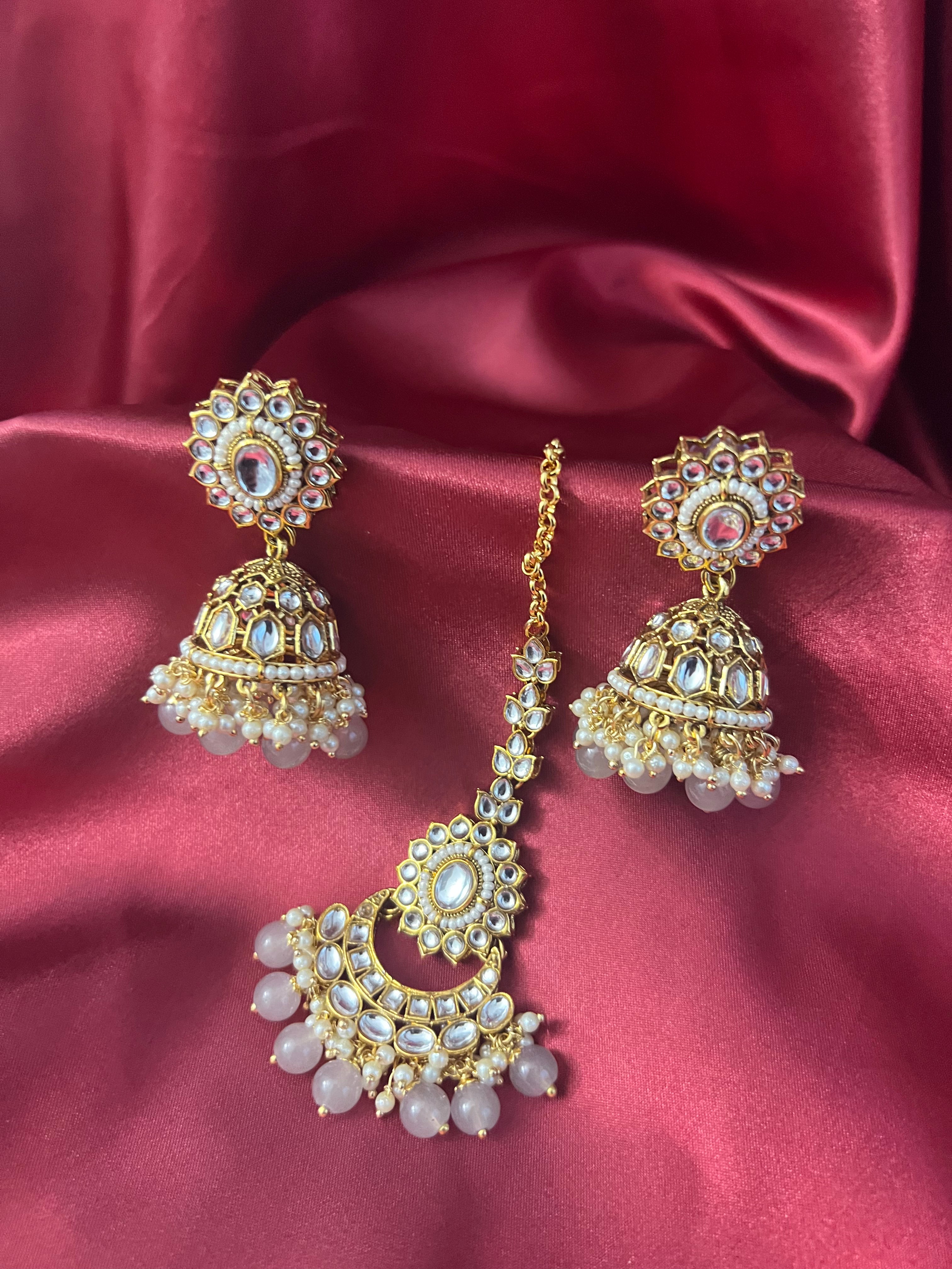 Superior quality kundan necklace with regular sized jhumkis and tikka