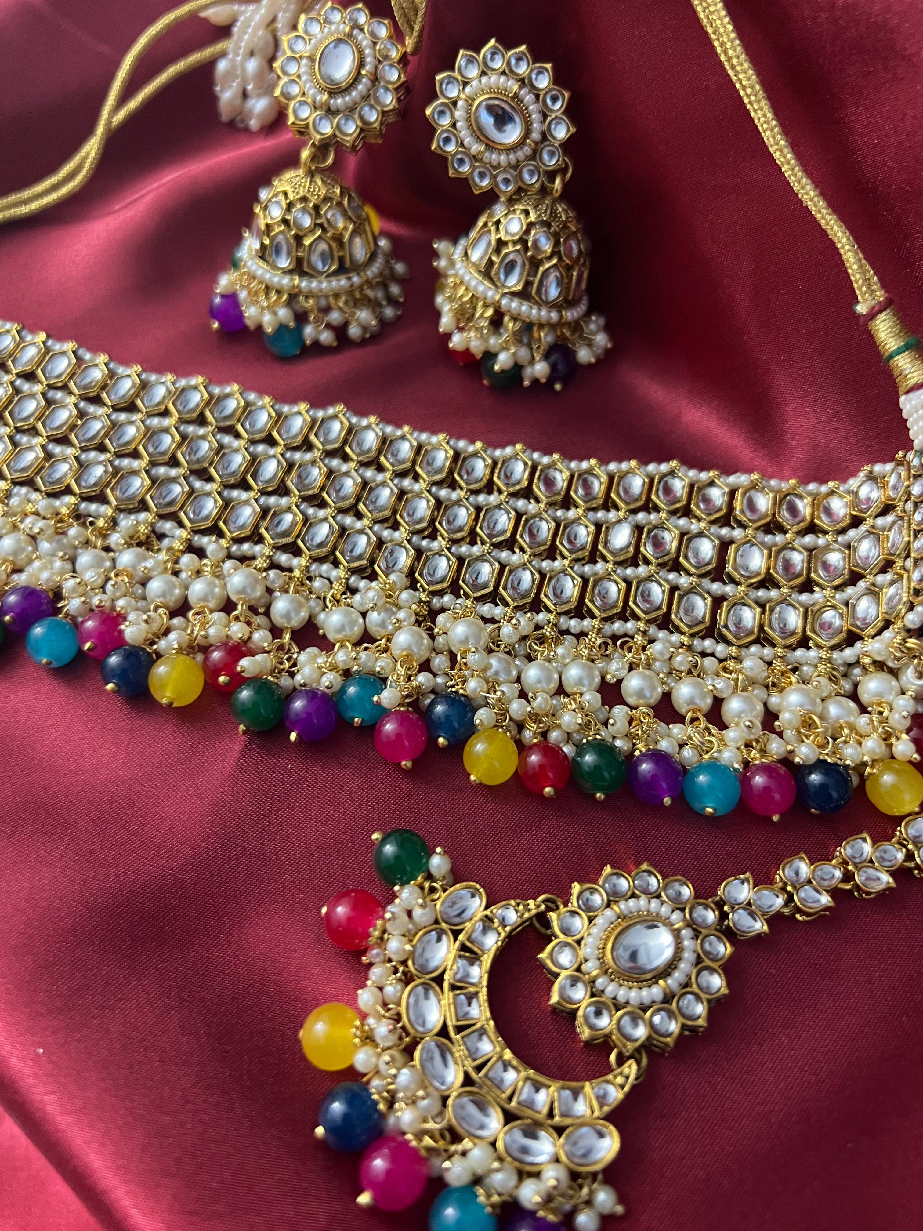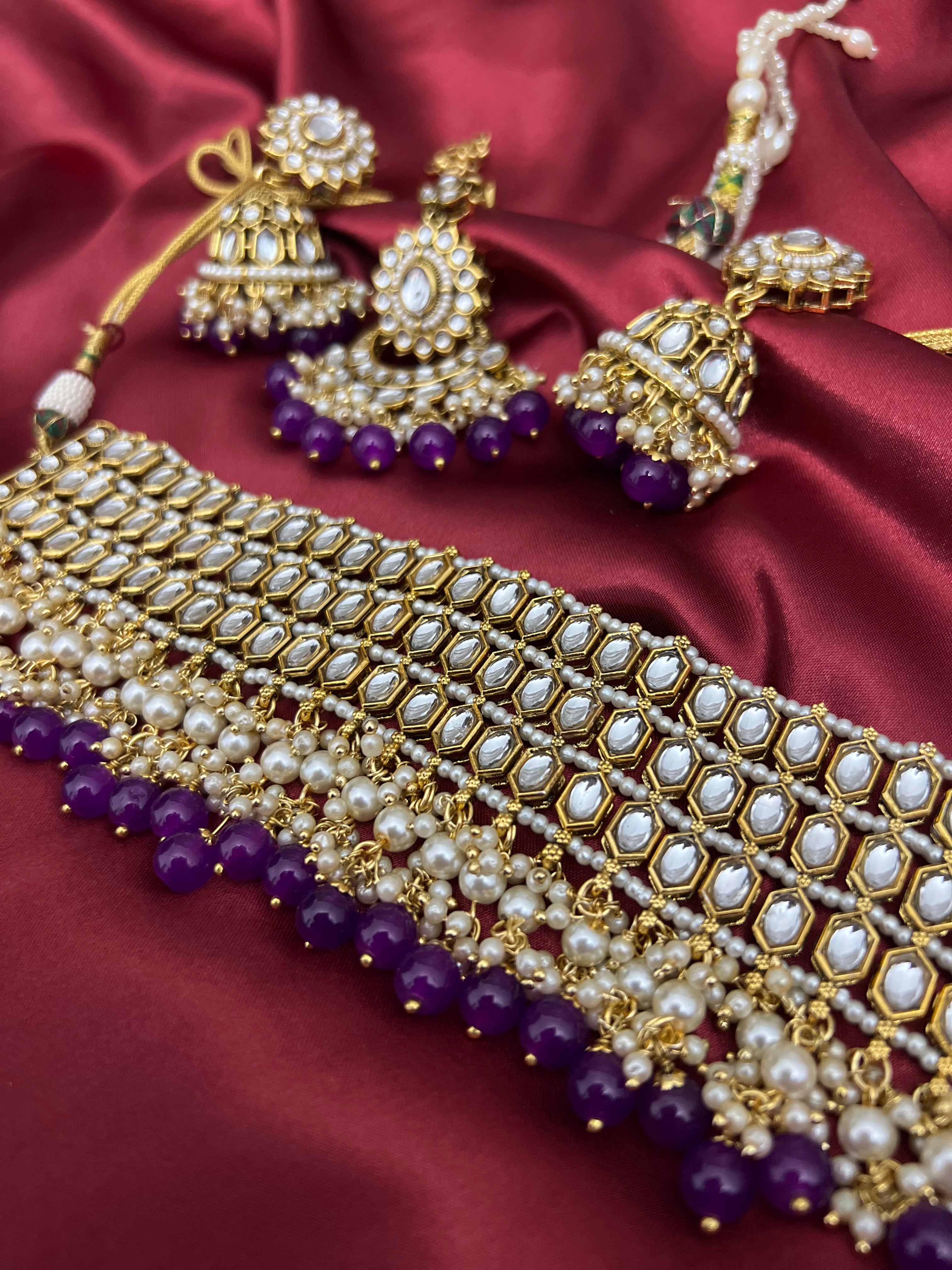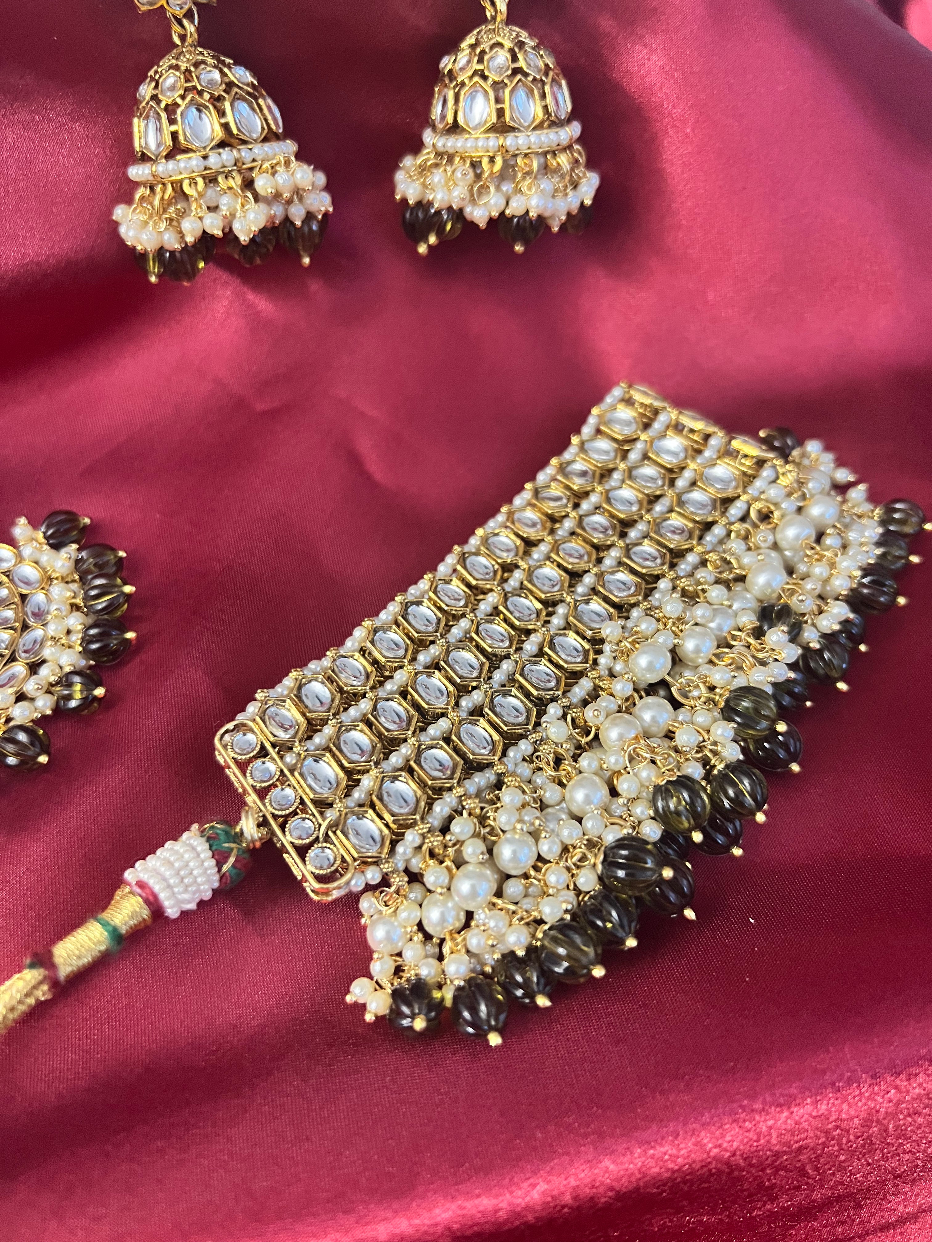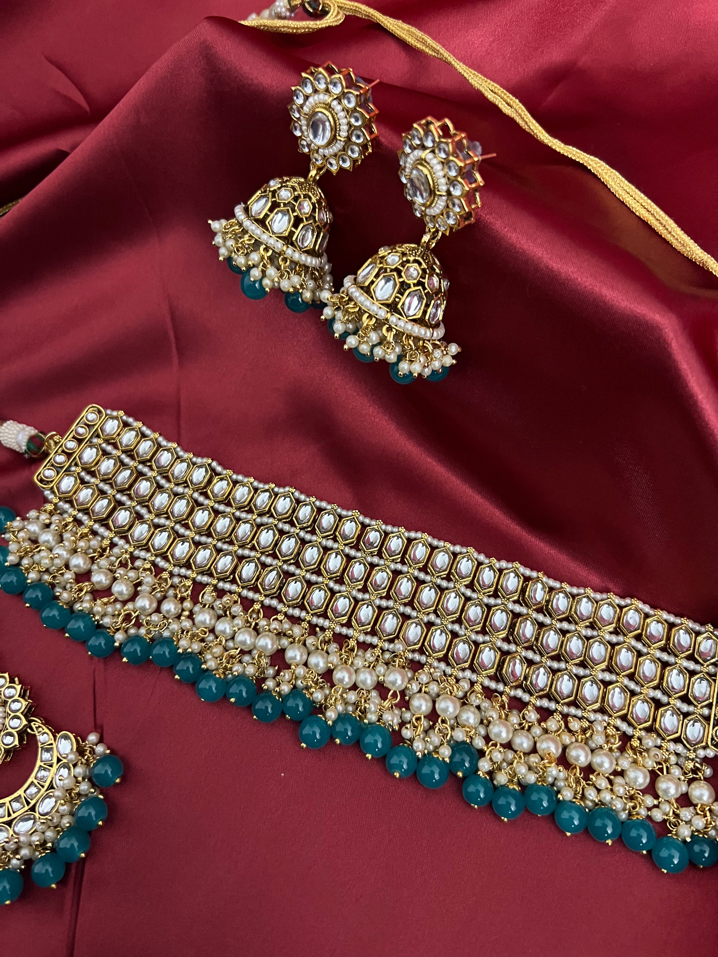 Superior quality kundan necklace with regular sized jhumkis and tikka