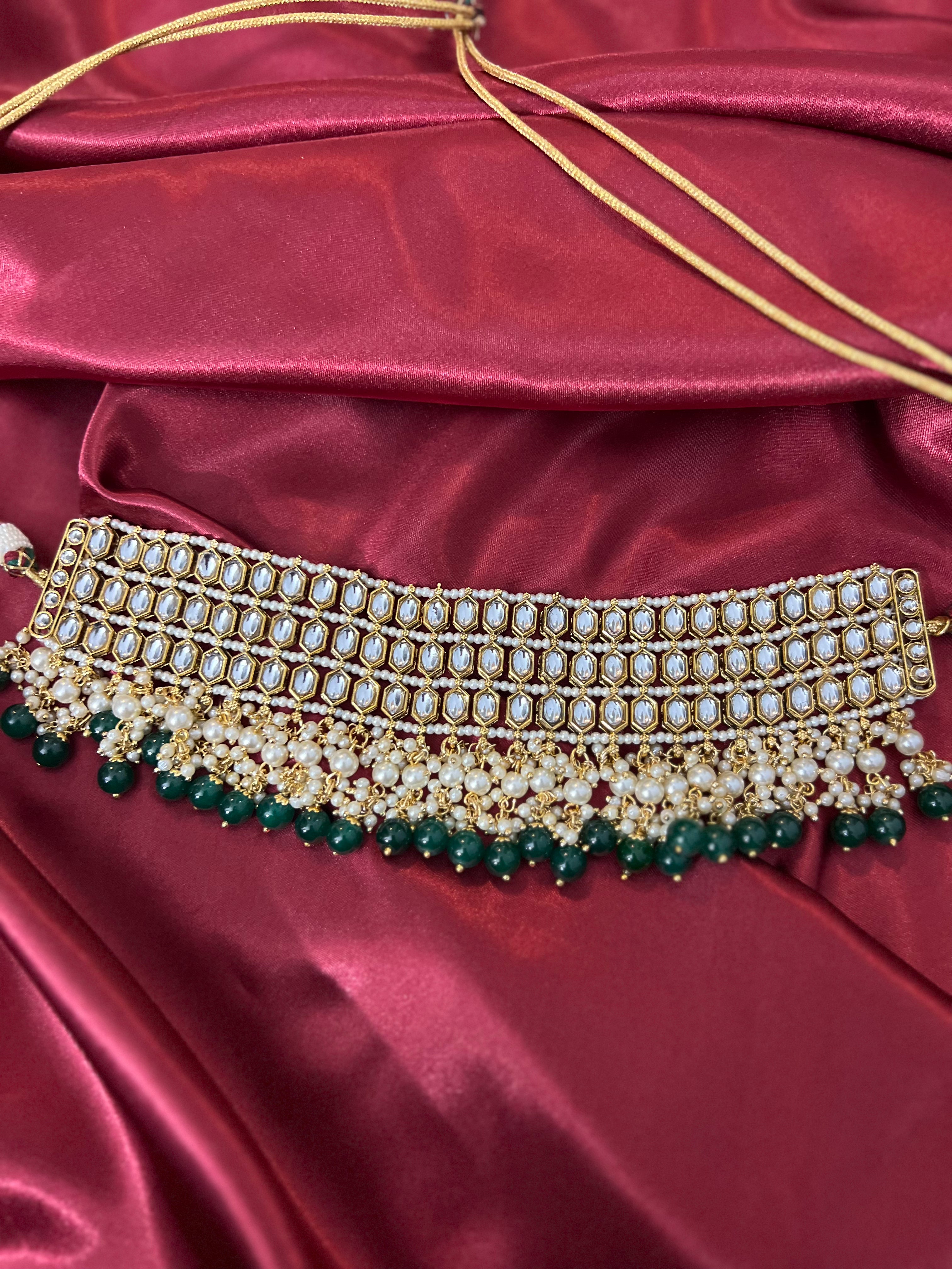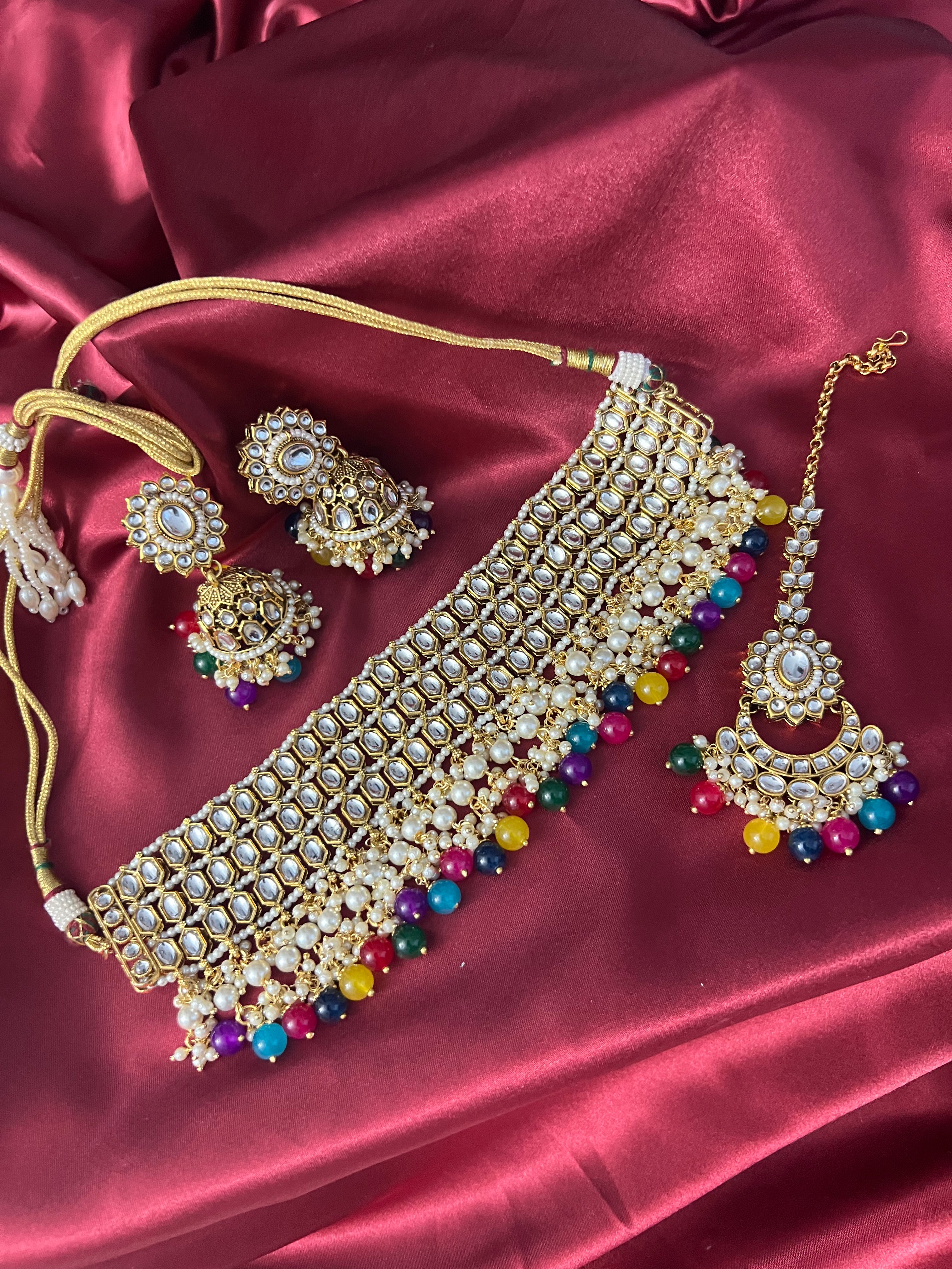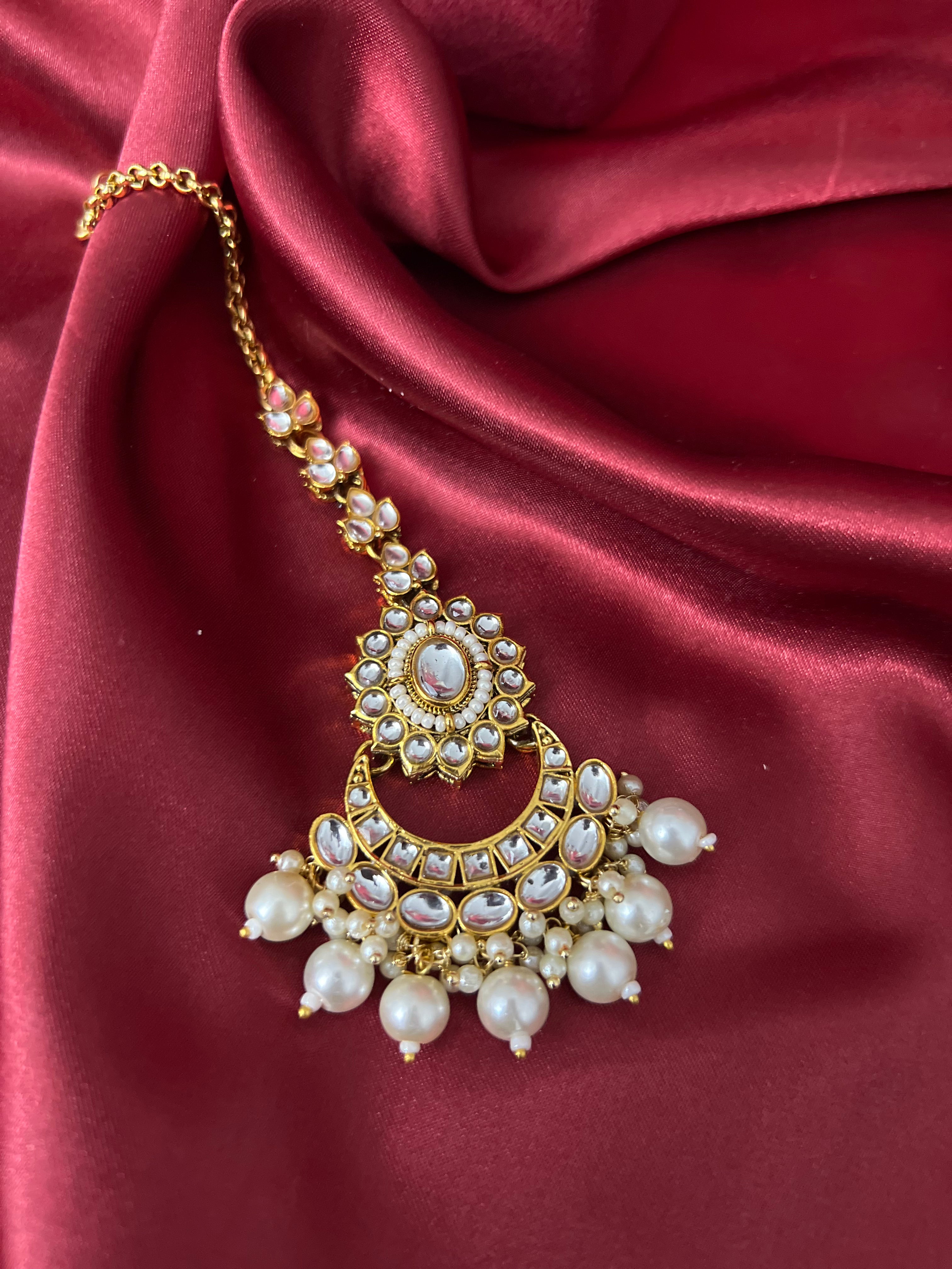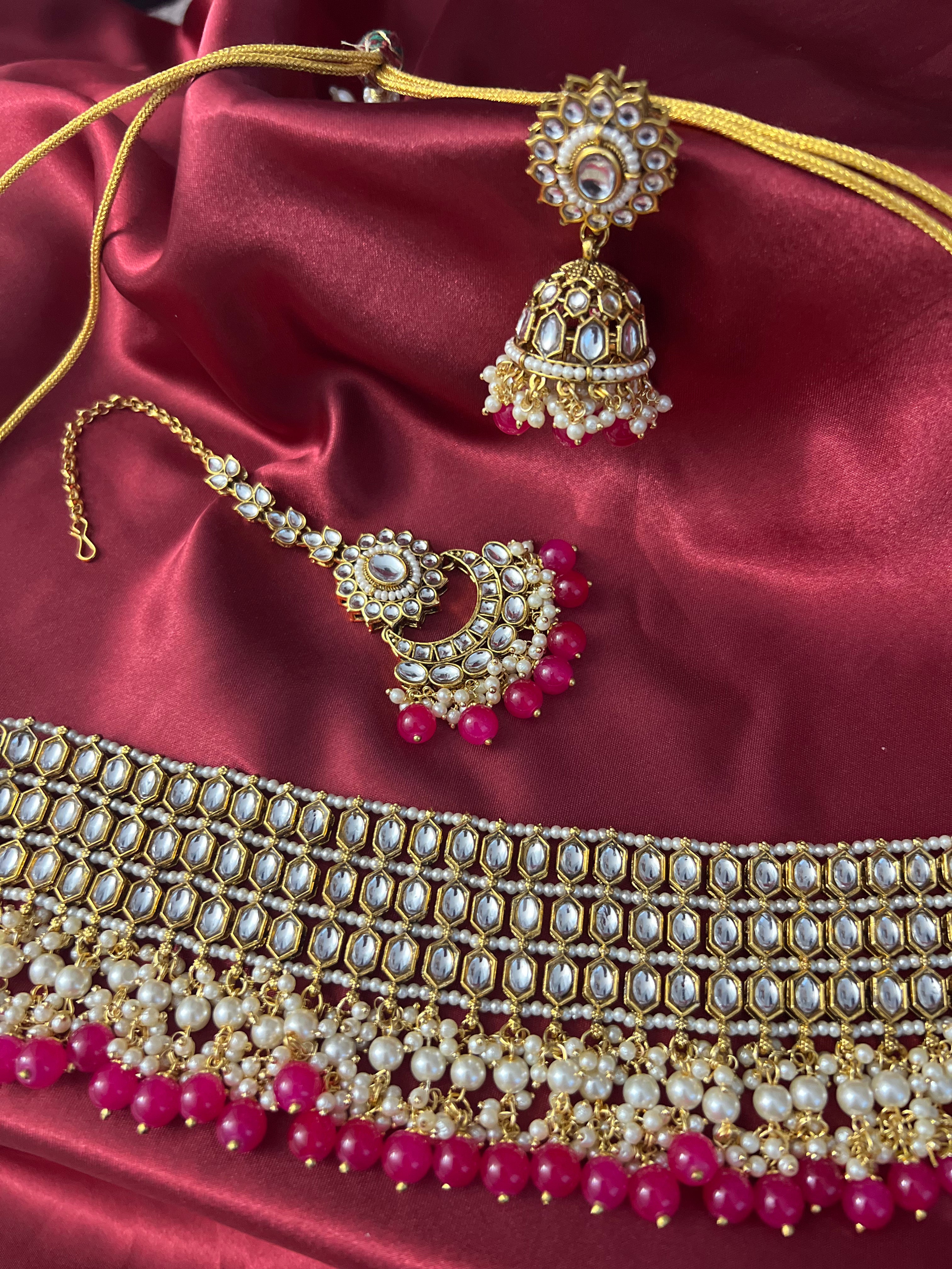 Superior quality kundan necklace with regular sized jhumkis and tikka