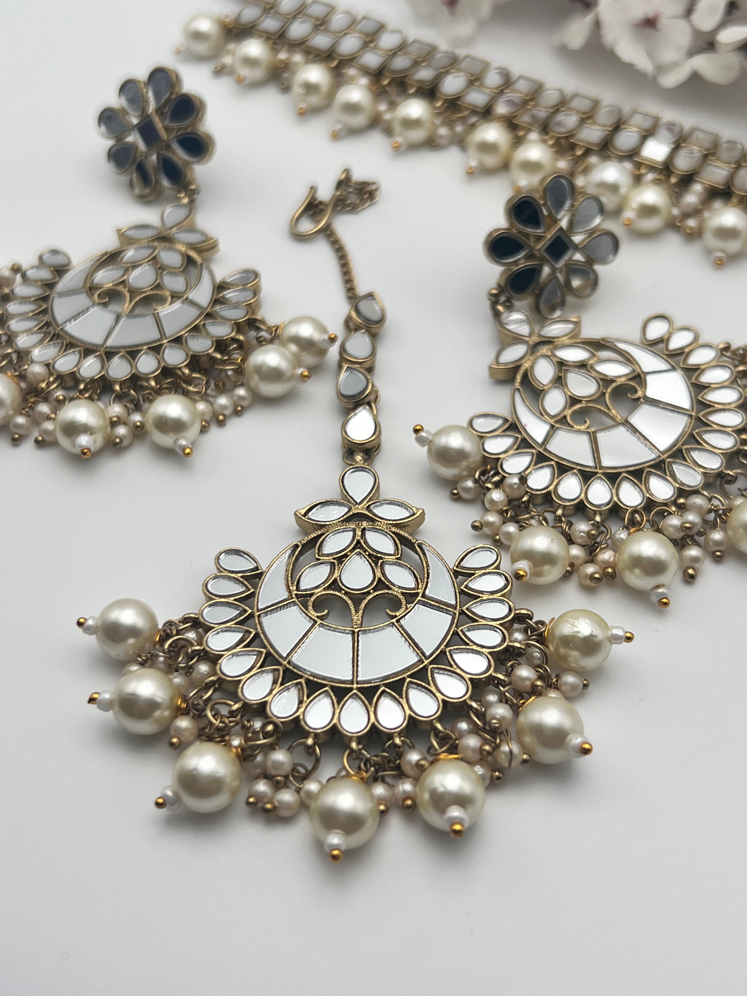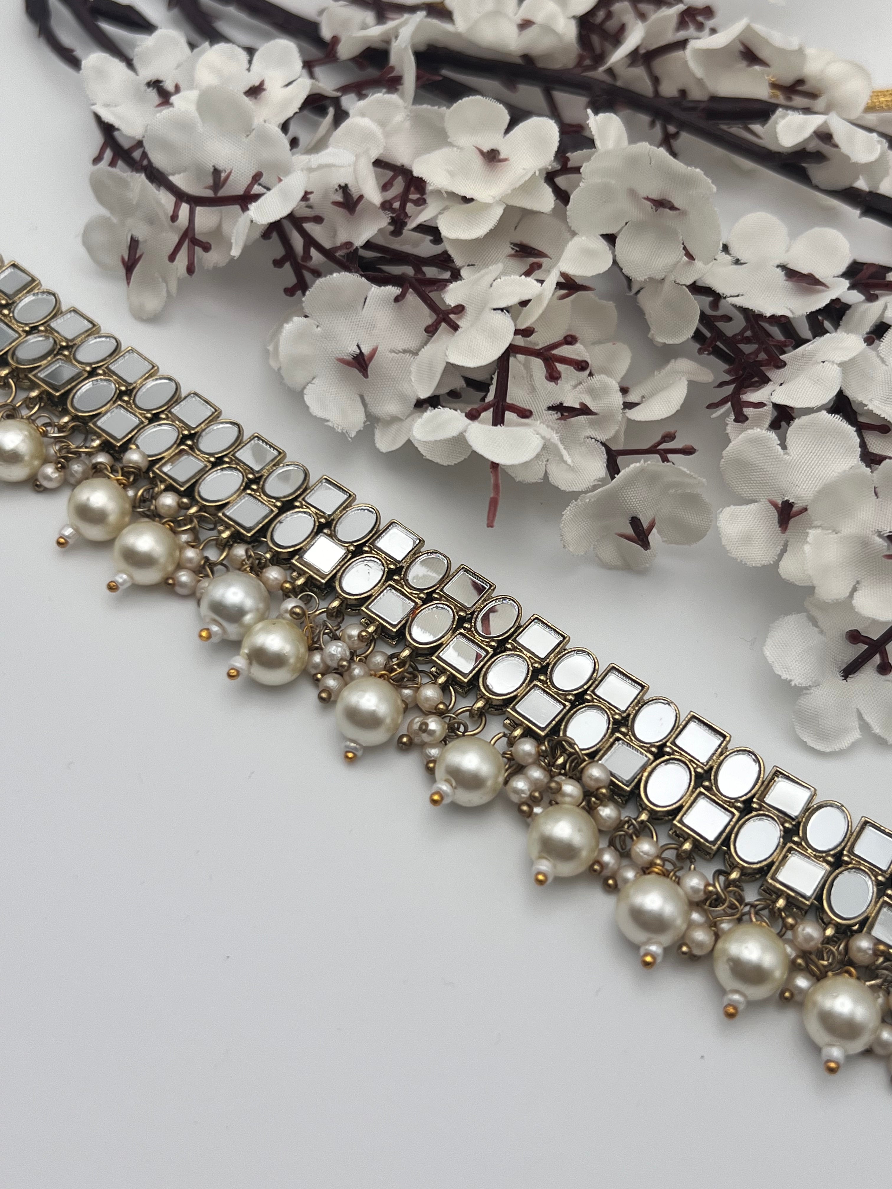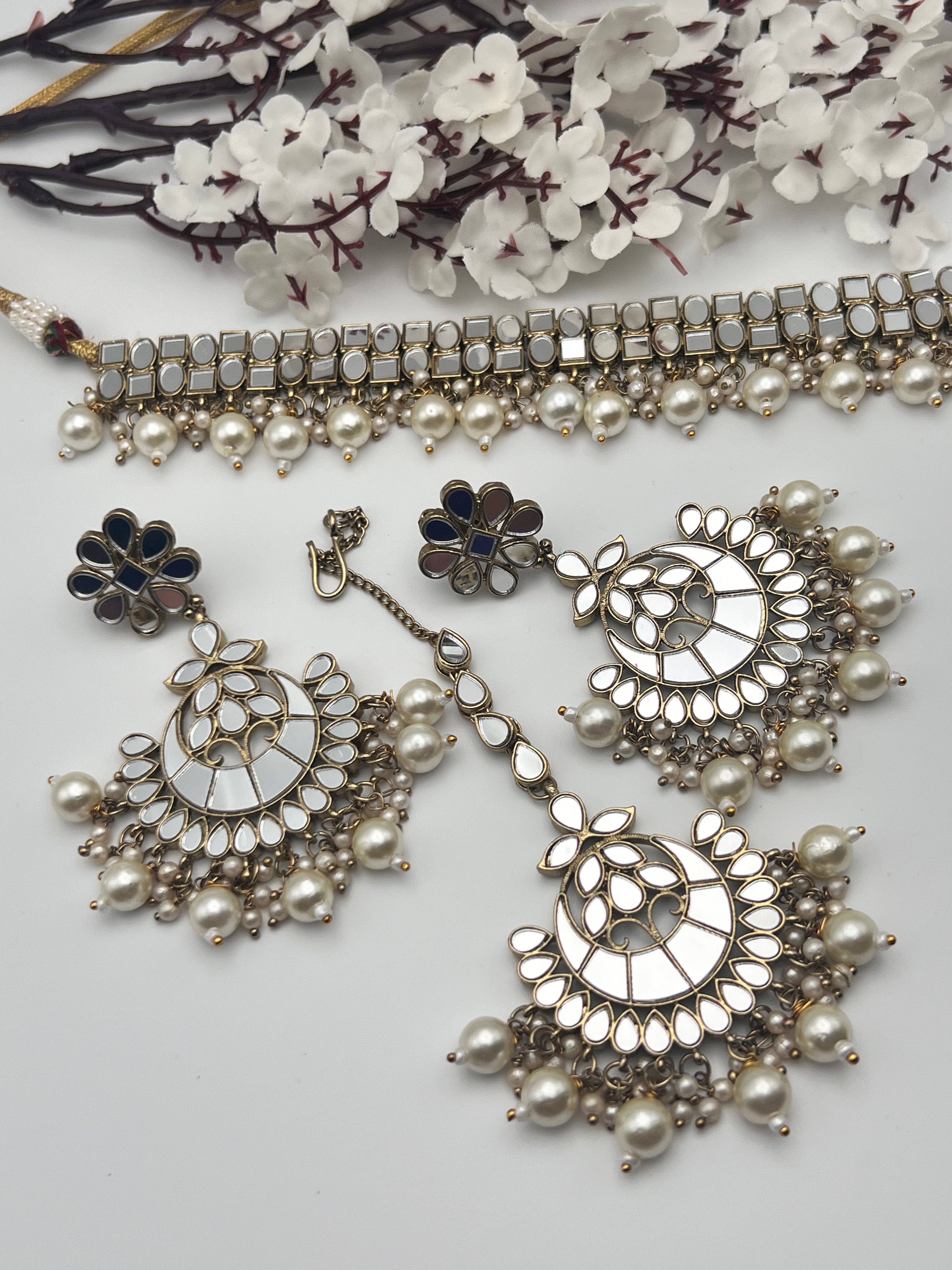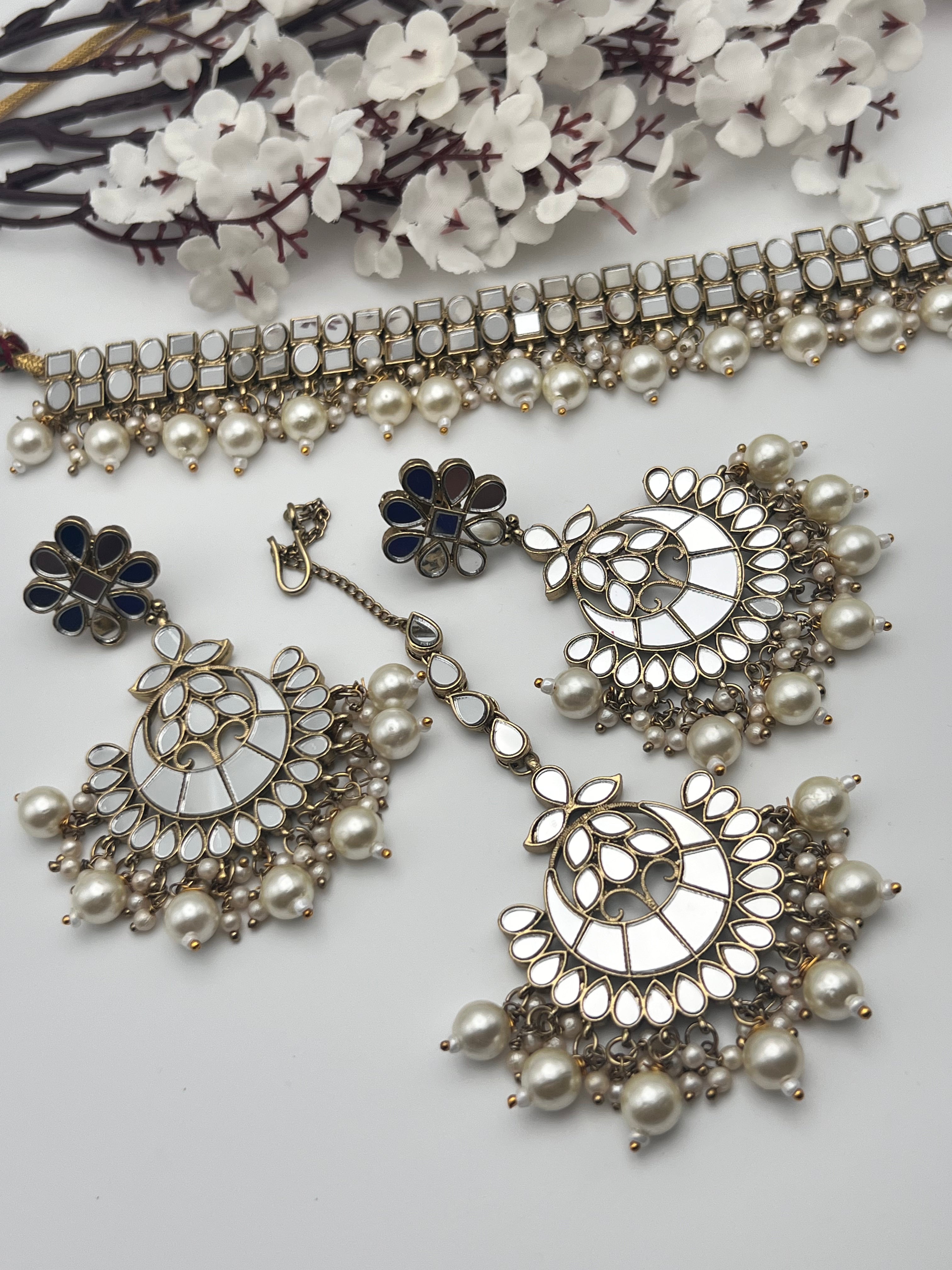 Mirror Choker style Necklace with lightweight earrings and Tikka