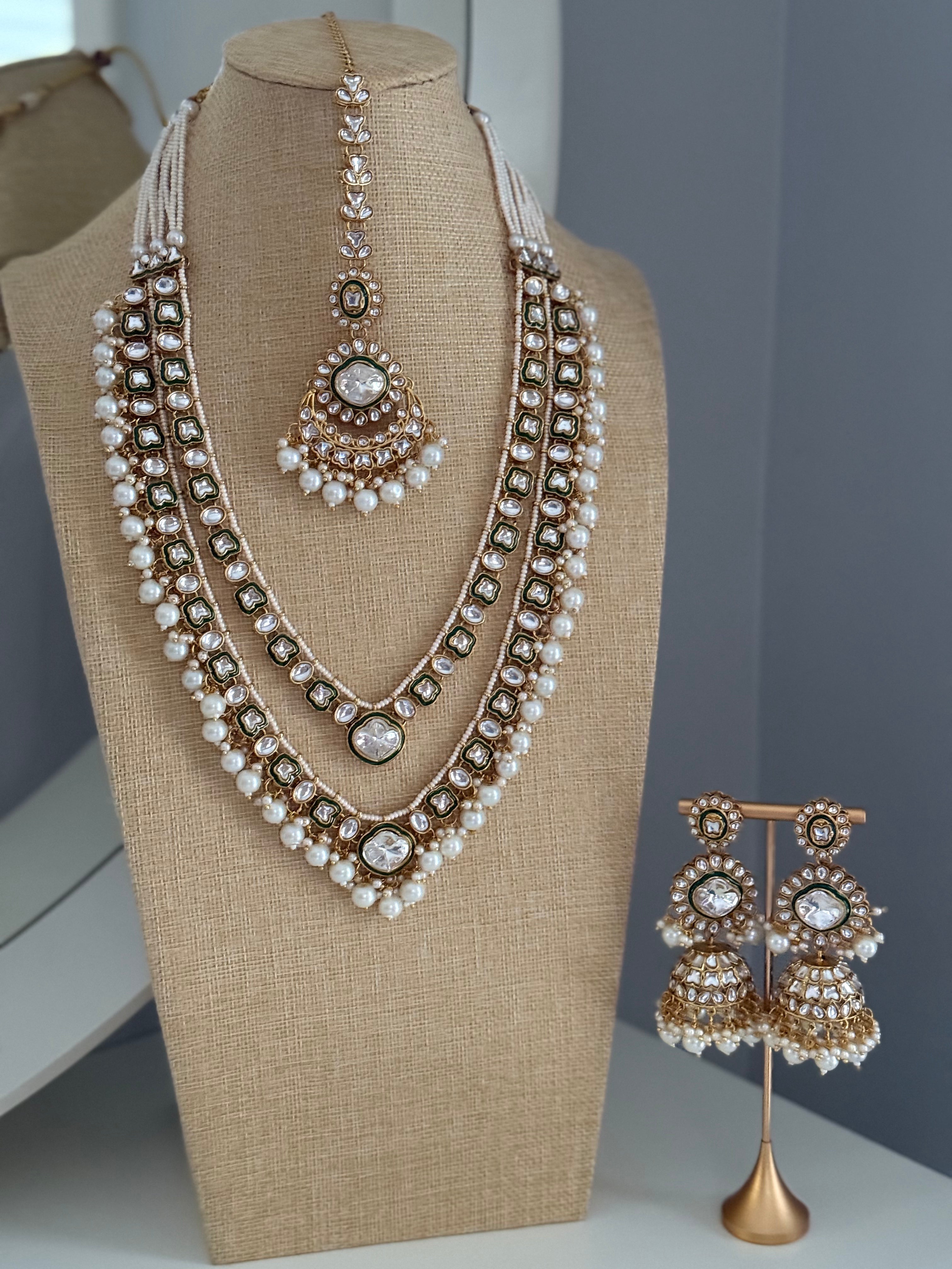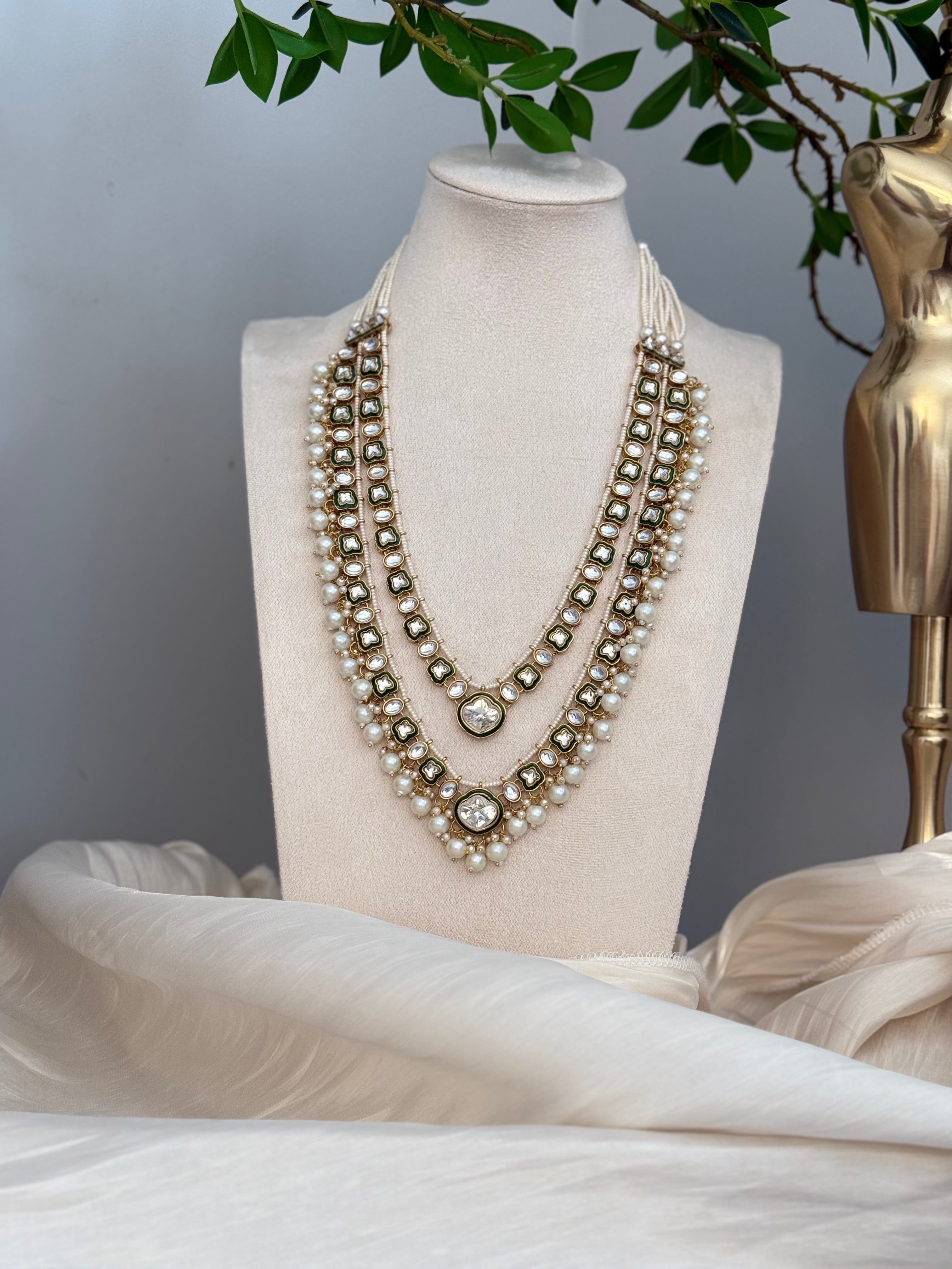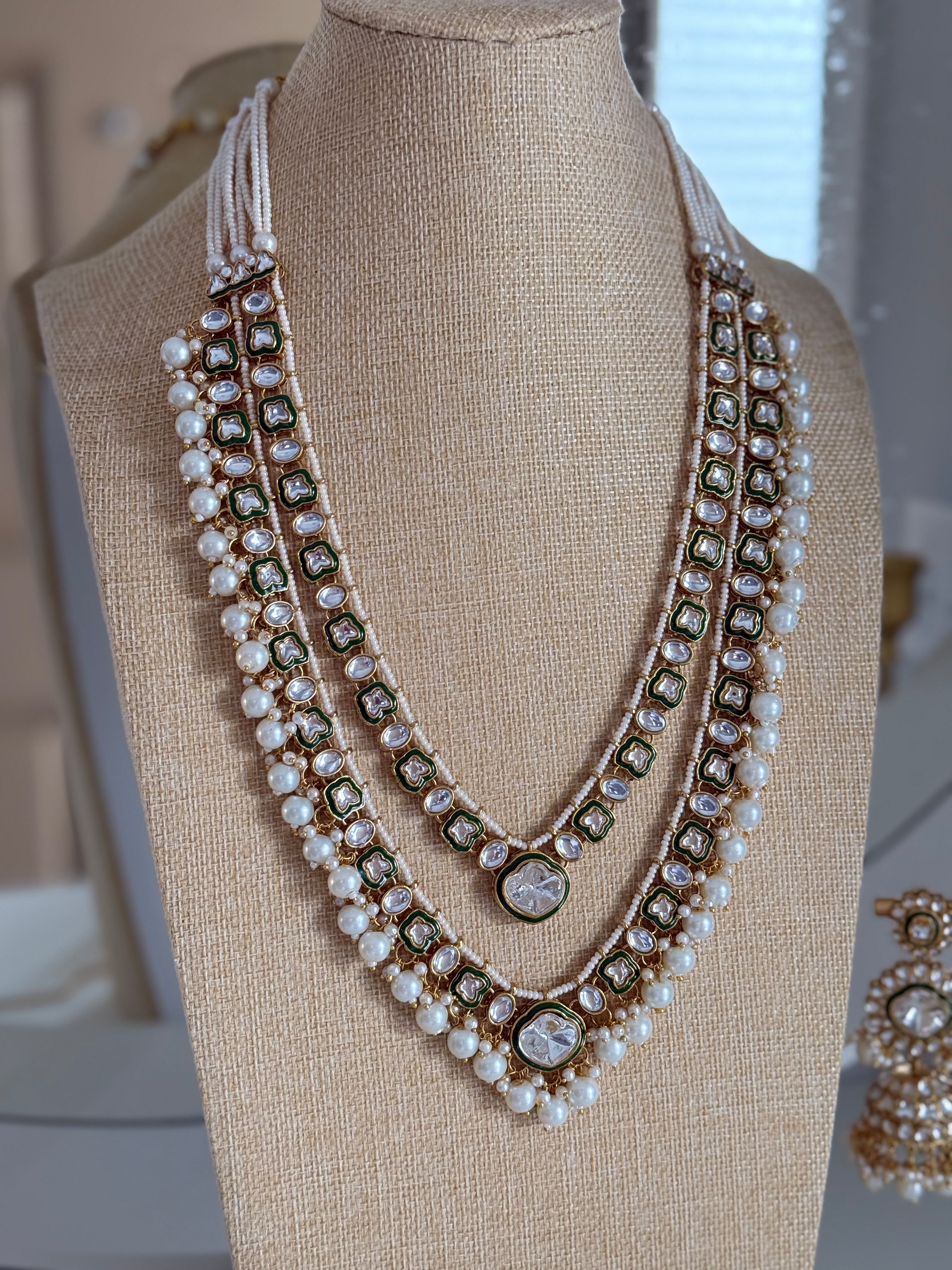 Introducing the exquisite Nida Double Layered Long Necklace Set. Handcrafted with precision, this set features a double layered design, adorned with kundan and meenakari work. The elegant jhumkas and tikka add a touch of sophistication, while the delicate white beads and hint of green elevate its allure. Elevate your style with Nida.