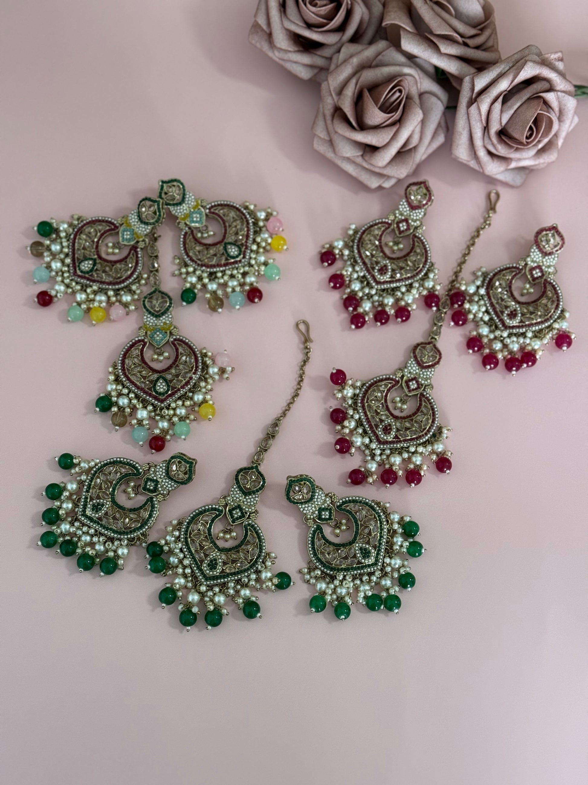 Add a touch of regal elegance to your look with our stunning Pakistani Earrings Tikka, featuring intricate polki work layered with delicate beads. This exquisite piece combines traditional craftsmanship with a modern flair, creating a captivating accessory that complements any occasion. The timeless polki stones are beautifully set, while the delicate bead layers add movement and texture, making it the perfect choice for weddings, parties, or festive celebrations. Whether you're the bride or a guest, this earrings tikka set will elevate your style and leave a lasting impression