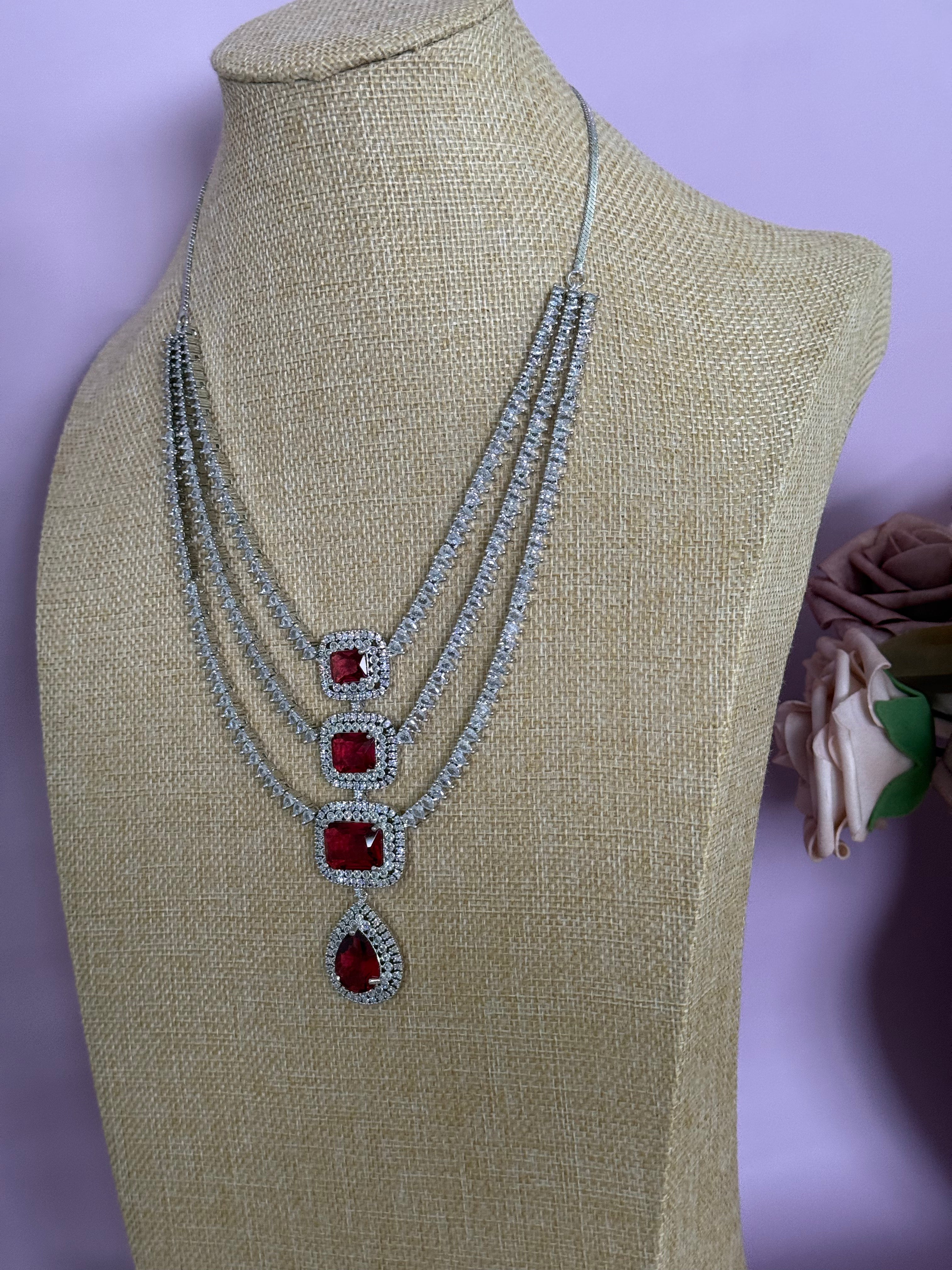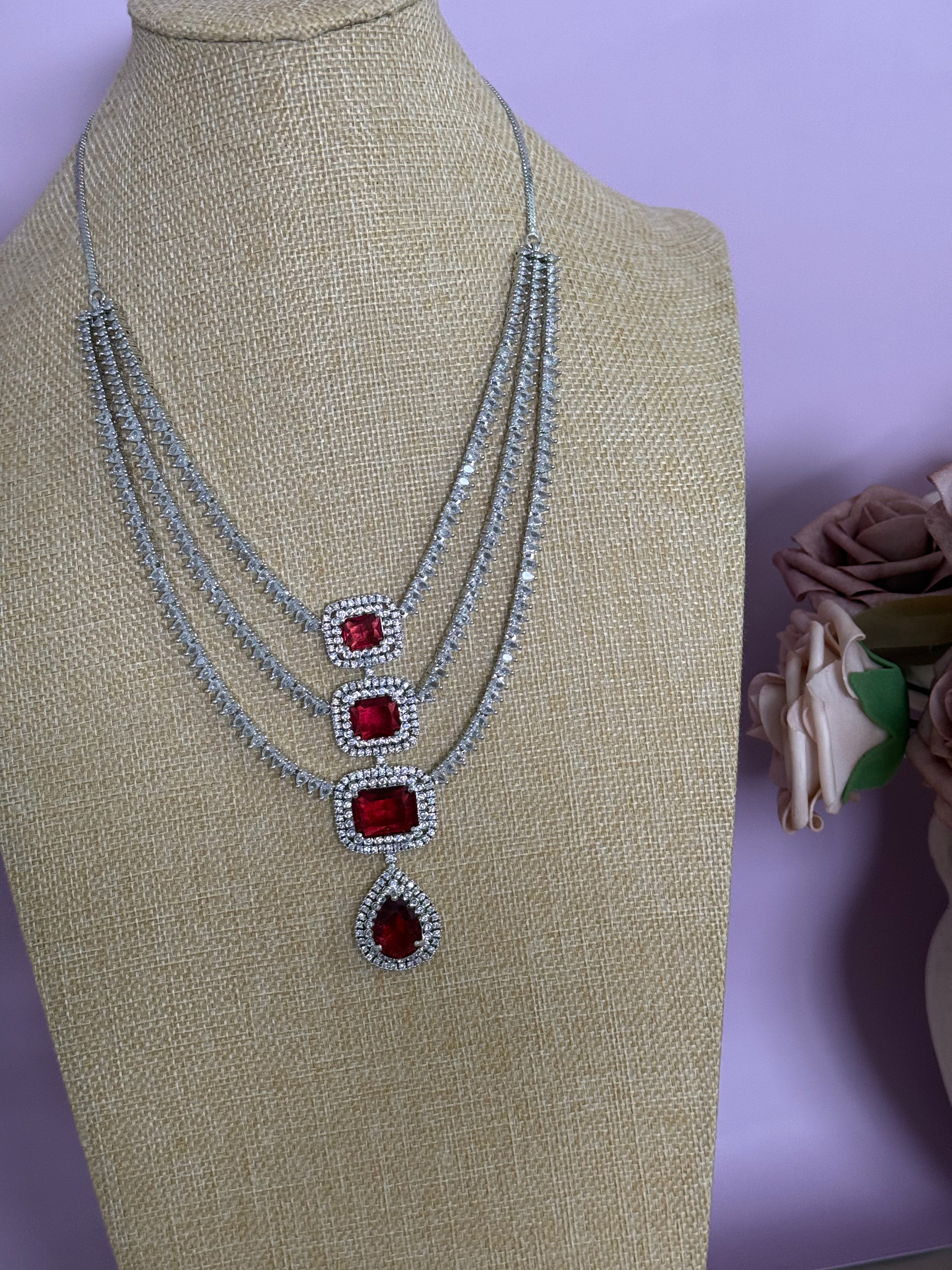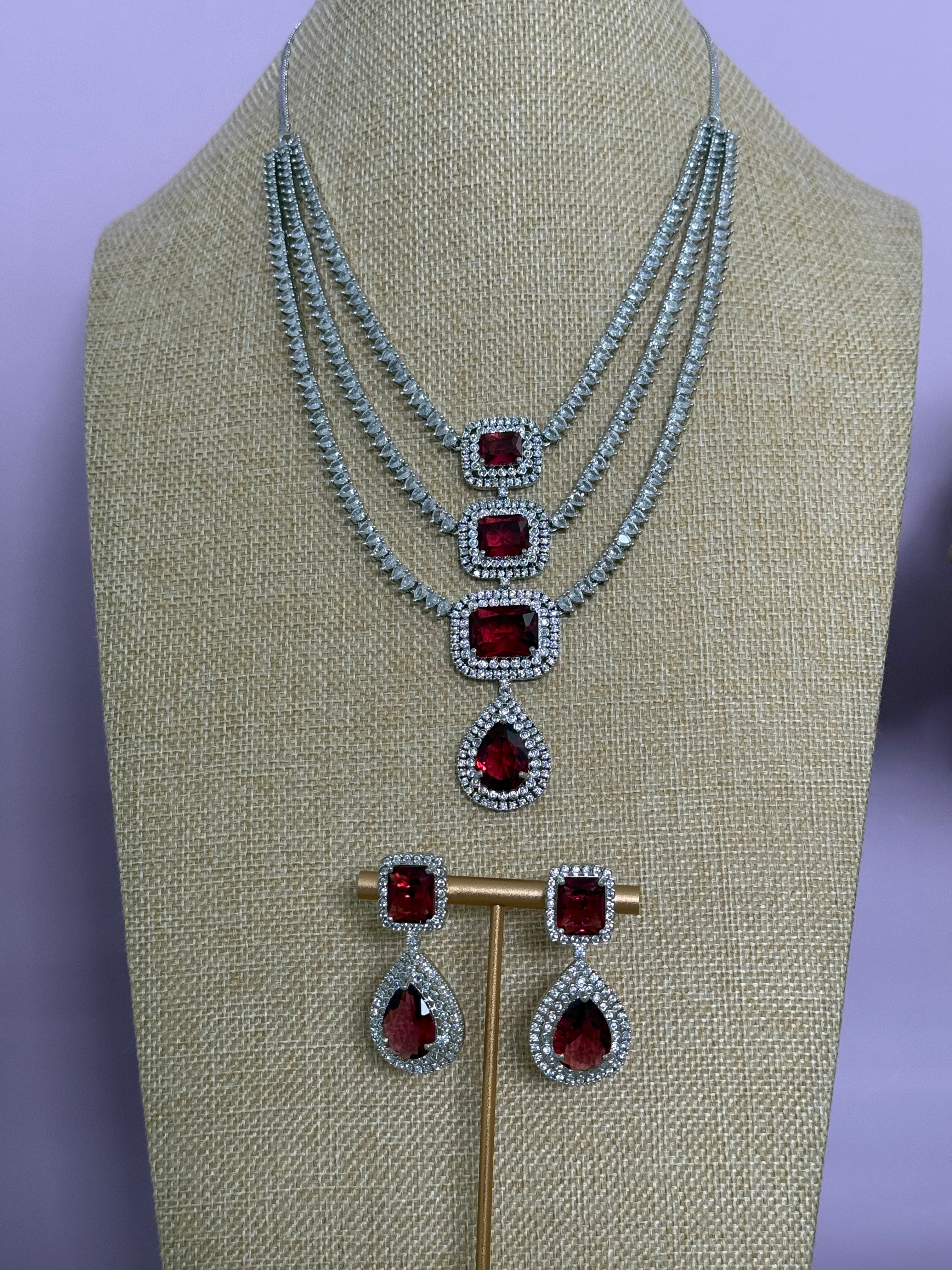 Discover the elegance of our Viti layered Necklace Set. Made with 3 layers of sparkling American diamonds, this necklace adds a touch of glamour to any outfit. Complete the look with the matching ruby colored dangle earrings. Elevate your style with this stunning set.
