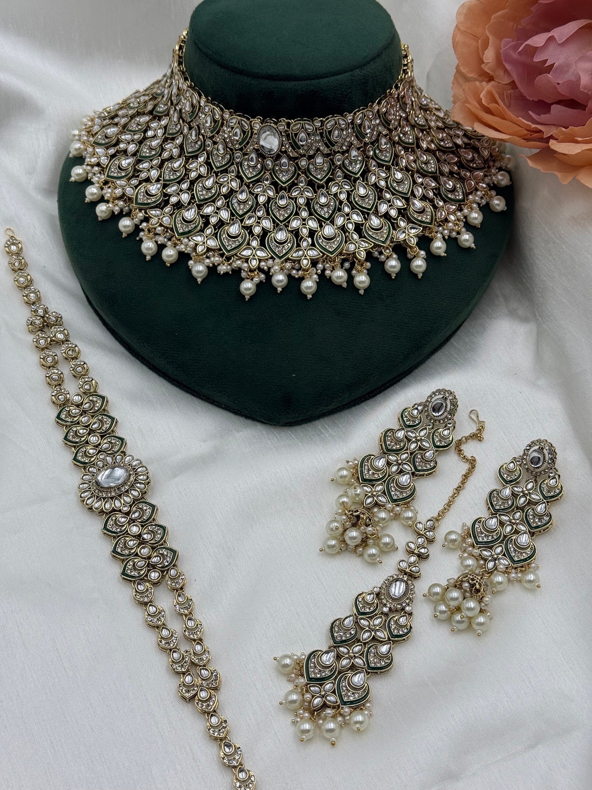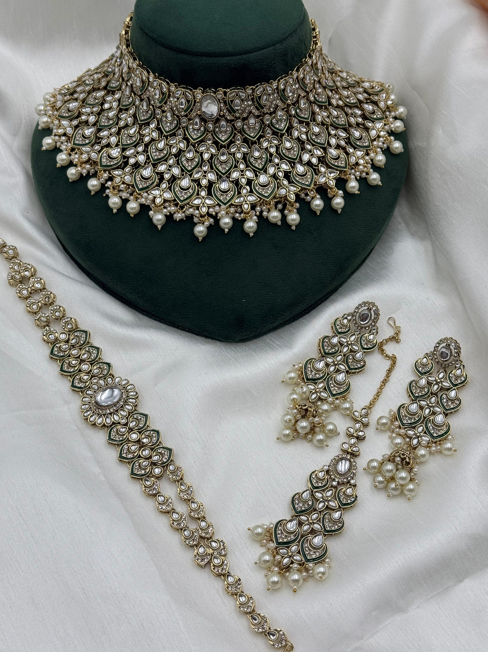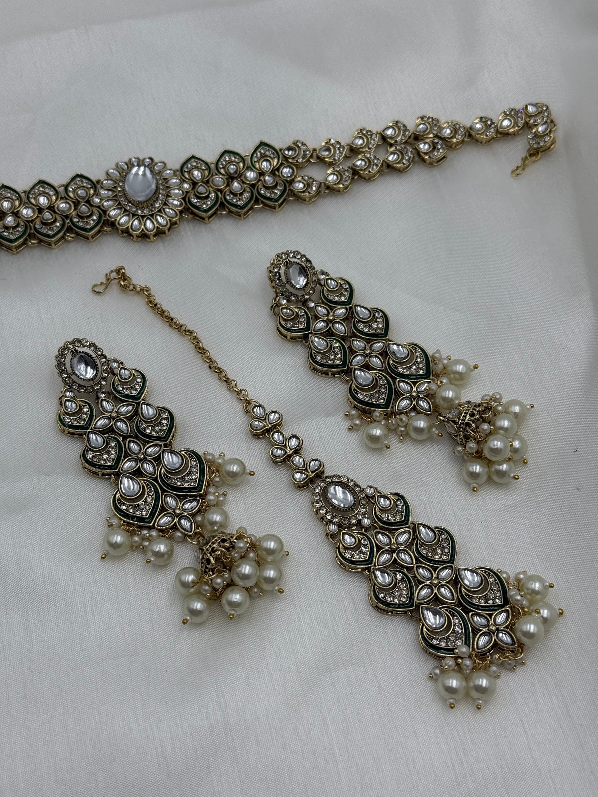 Kundan heavy looking necklace set with lightweight earrings and tikka and sheeshphool.